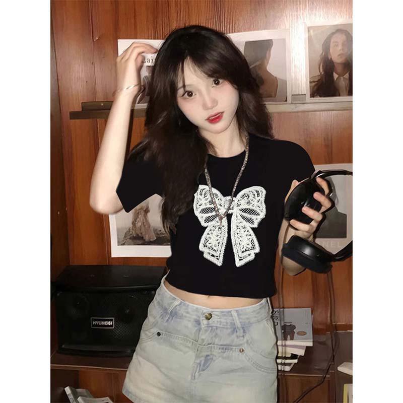 热辣美式短袖t恤女早春爆款穿搭蝴蝶结修身短款辣妹卡腰上衣