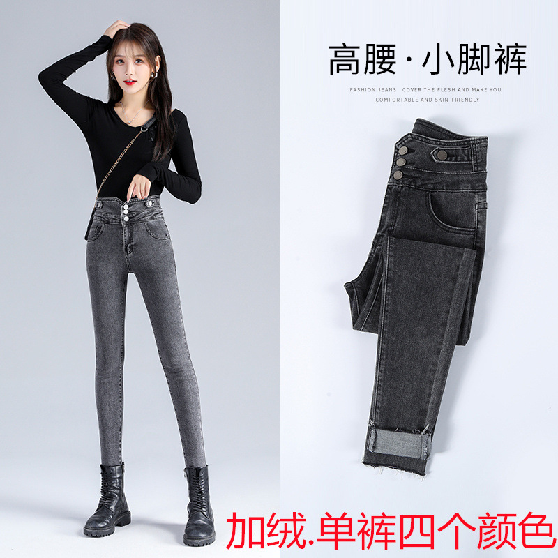 HEY+JEANS复古牛仔裤女春季韩版高腰显瘦弹力紧身排扣小脚裤