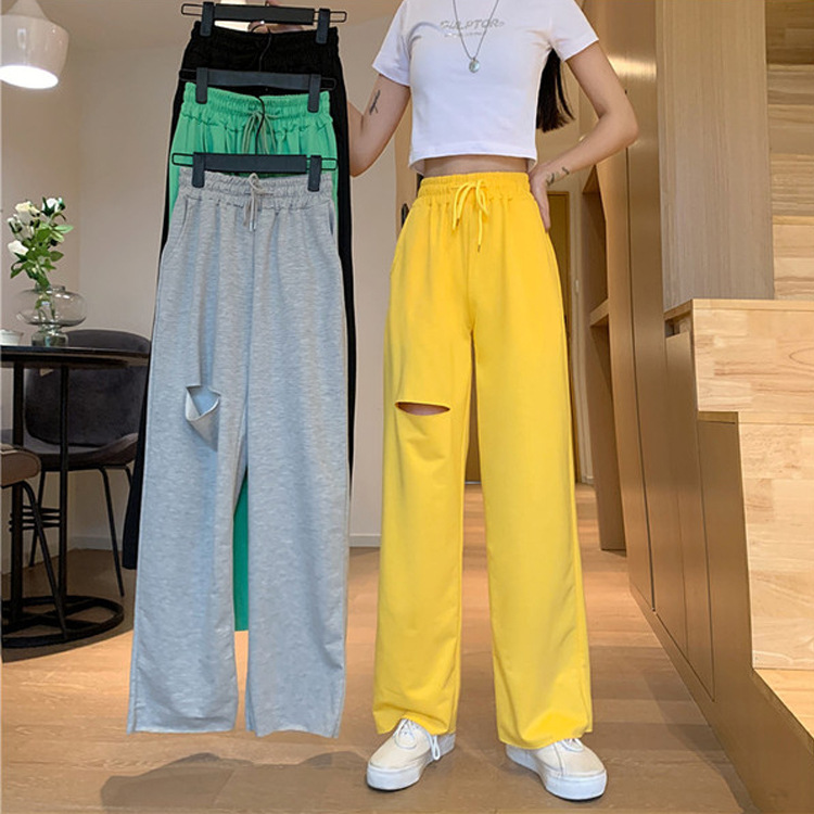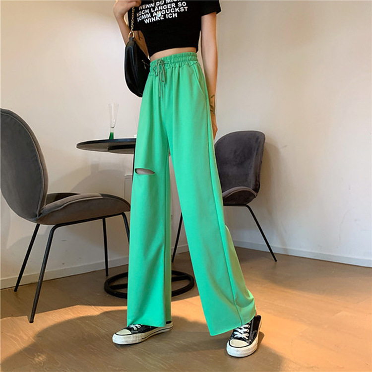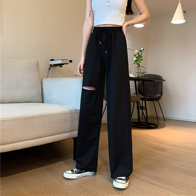 薄款破洞直筒阔腿裤女夏高腰新款韩版垂感宽松显瘦休闲拖地裤长裤