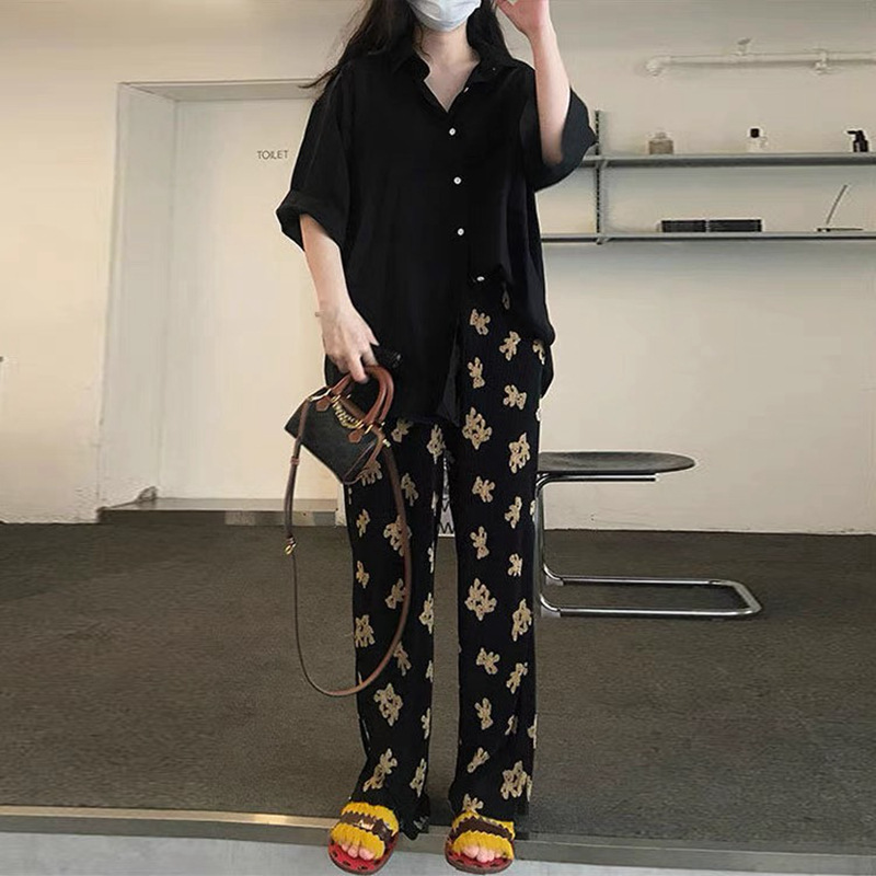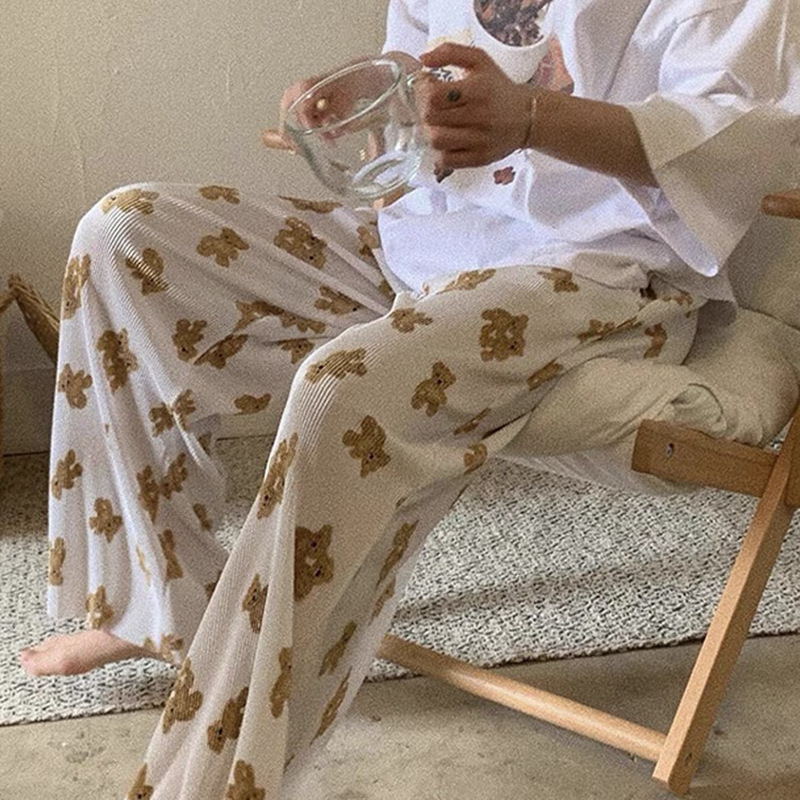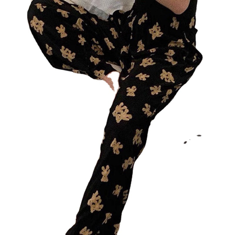 卡通小熊印花长裤女夏季新款宽松休闲百褶阔腿裤子外贸