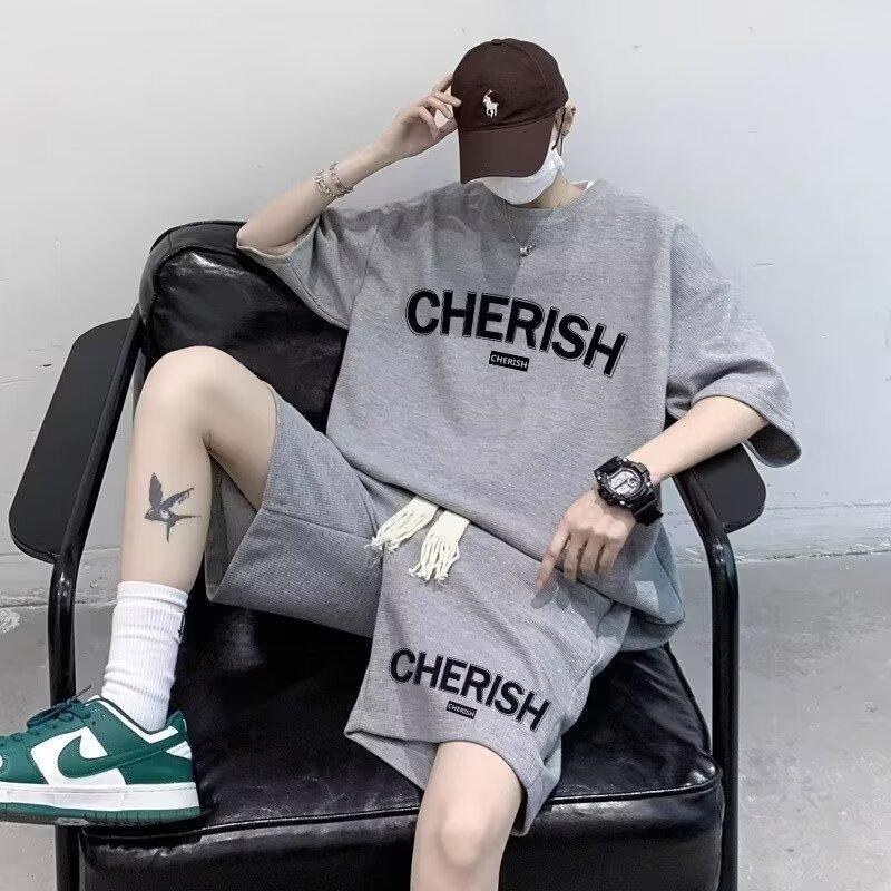 潮牌hiphop运动休闲套装男华夫格大码美式短袖短裤空调服酷帅穿搭
