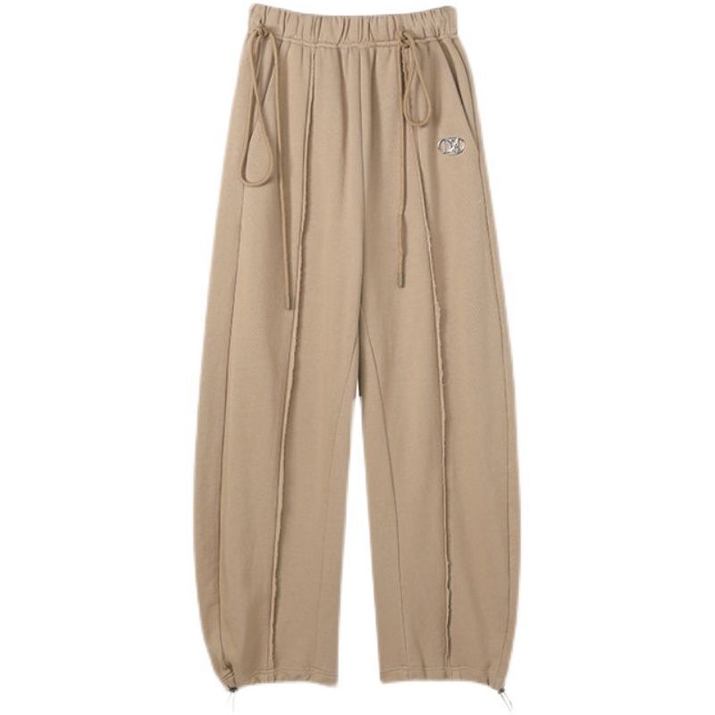 美式复古刺绣拼接不规则裤子女夏季薄款抽绳阔脚卫裤情侣束脚裤潮
