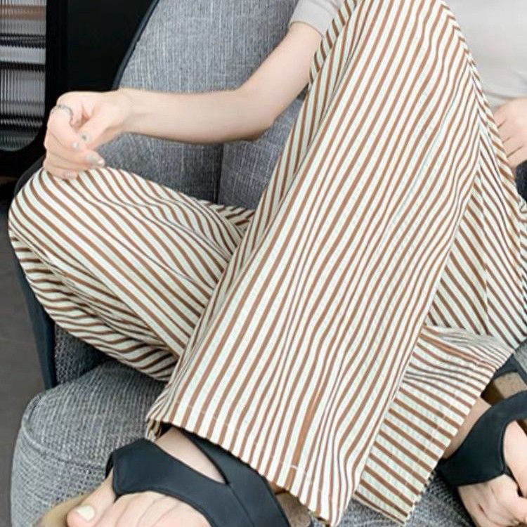 竖条纹冰丝阔腿裤女新款宽松显瘦美式复古直筒长裤夏季薄款休闲裤