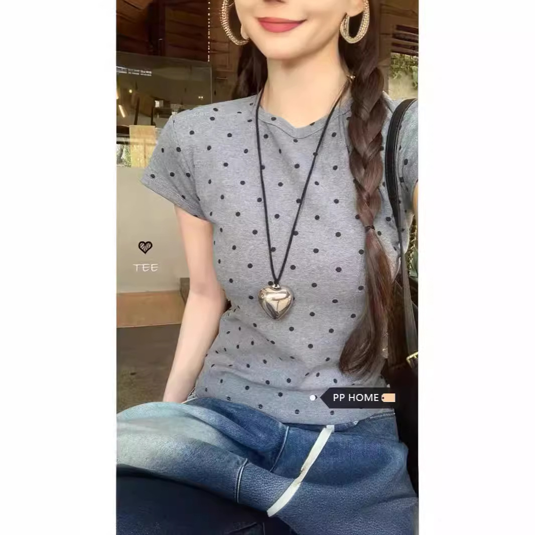 亿涵梦夏季miu系显瘦百搭圆领短袖T女短款波点设计感辣妹修身上衣