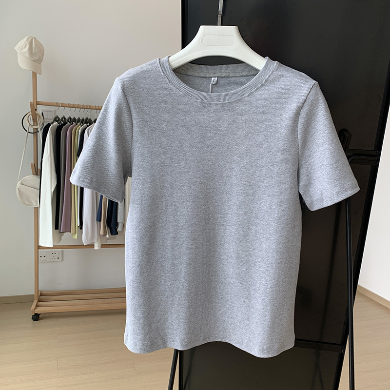 螺纹短袖t恤女夏季新款螺纹通勤圆领基础款纯色百搭打底上衣