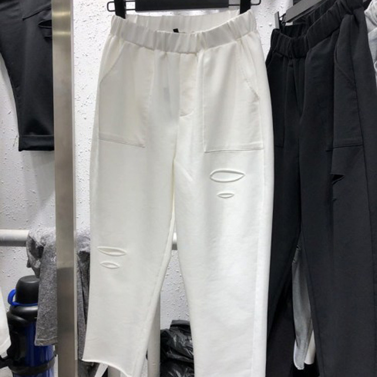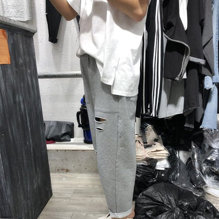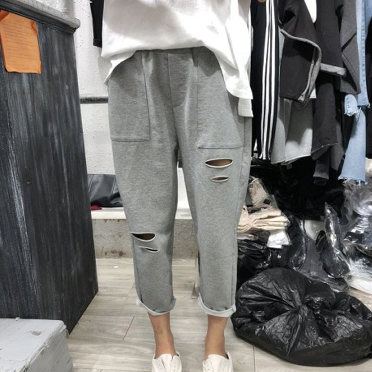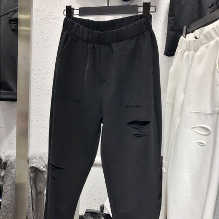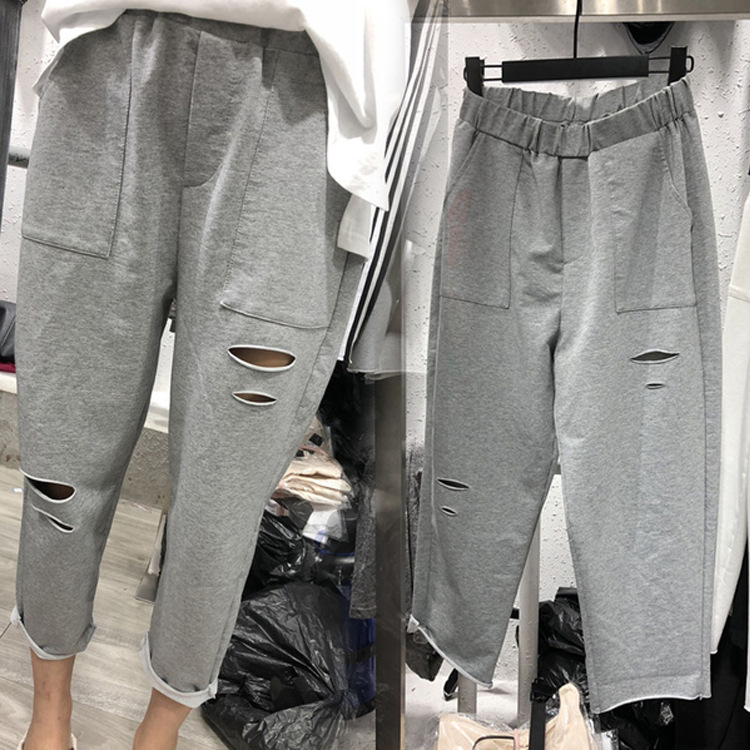 休闲裤子女宽松直筒松紧腰春夏阔腿运动裤破洞哈伦裤小个子九分裤
