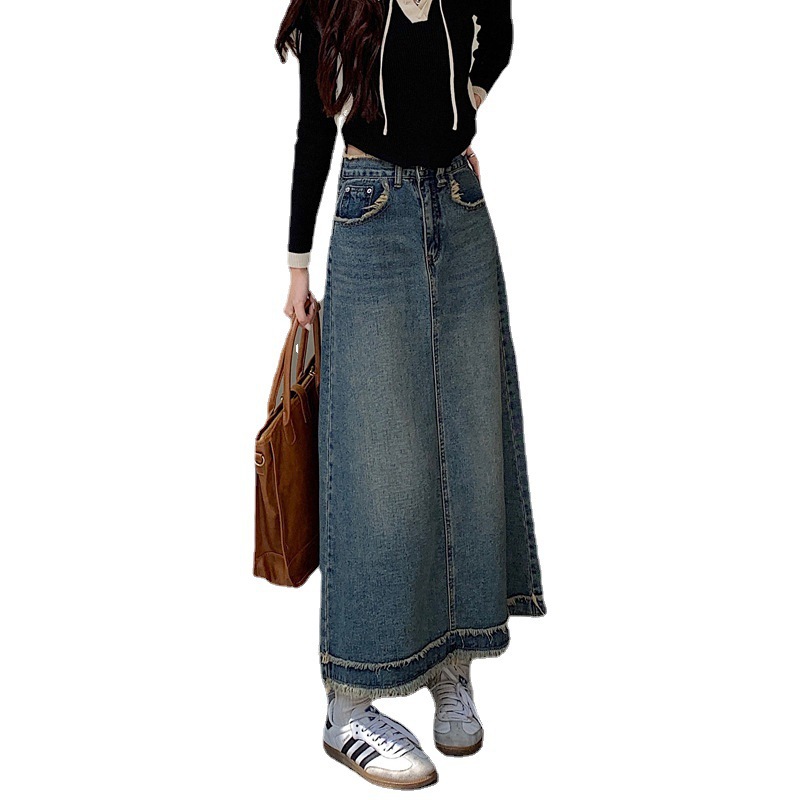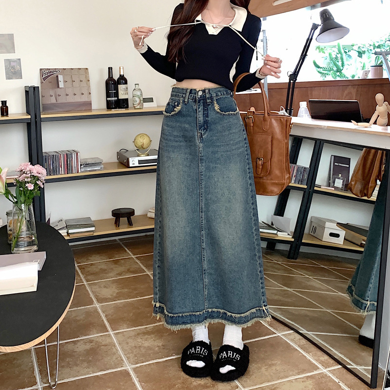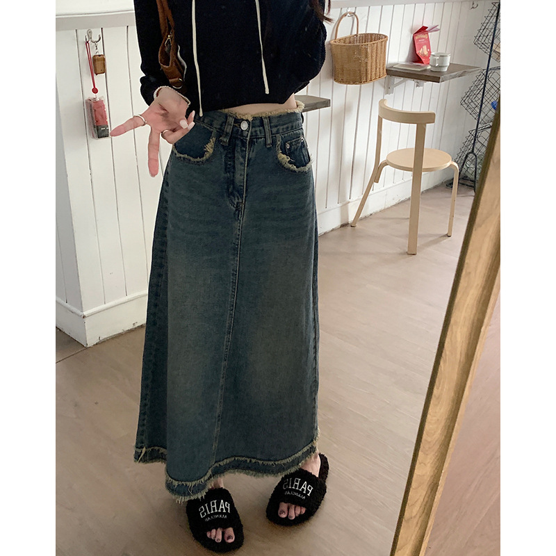 毛边牛仔半身裙女春夏个性街头设计感腰头下摆韩版高腰中长款裙子