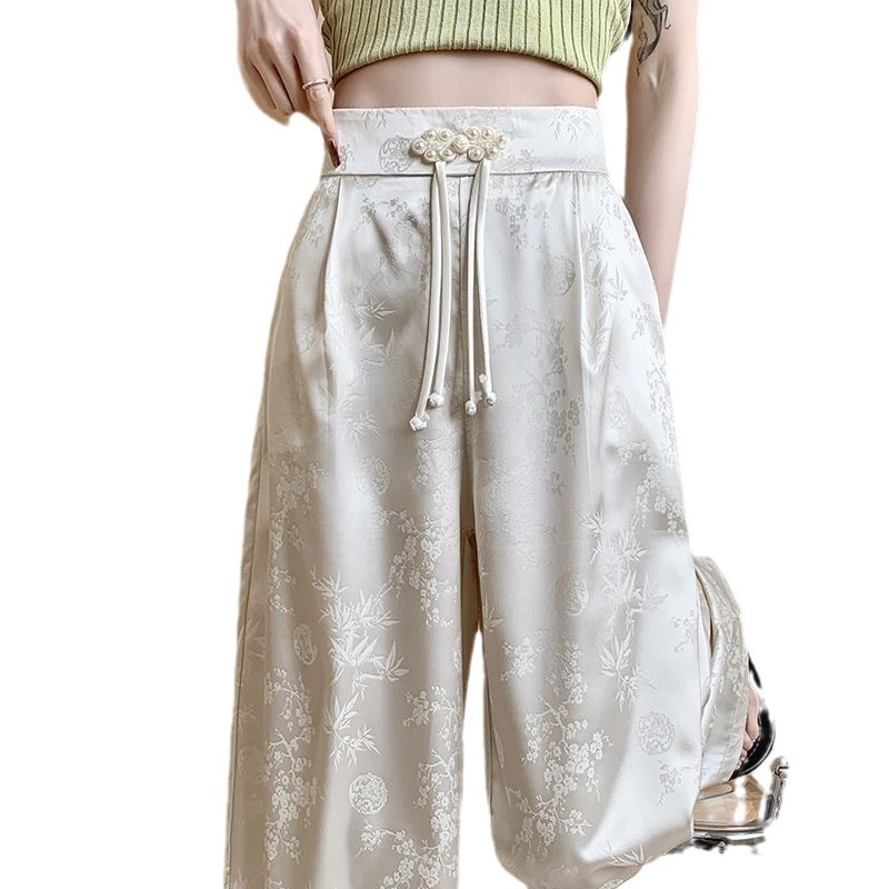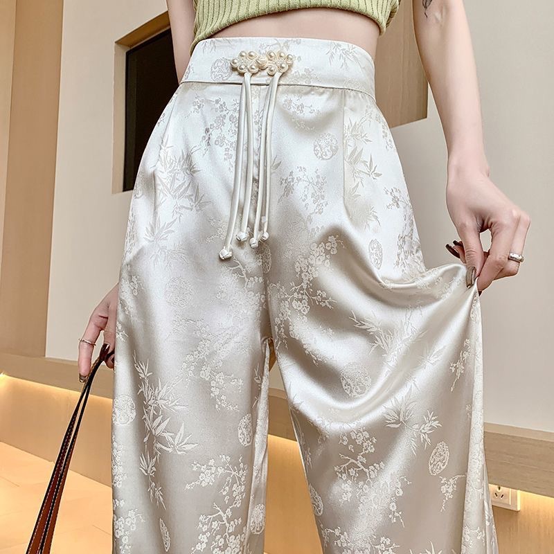 现货新中式国风缎面提花阔腿裤女春夏新款高腰显瘦垂感休闲拖地裤