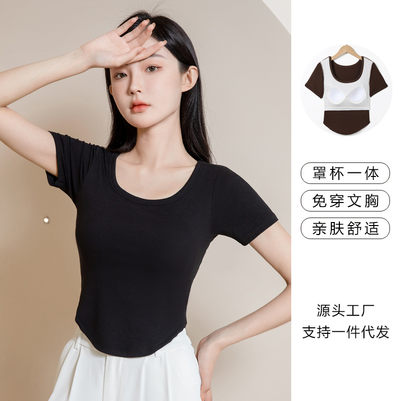 韩版潮流圆领短袖带胸垫一体式圆下摆齐腰打底衫休闲百搭T恤女