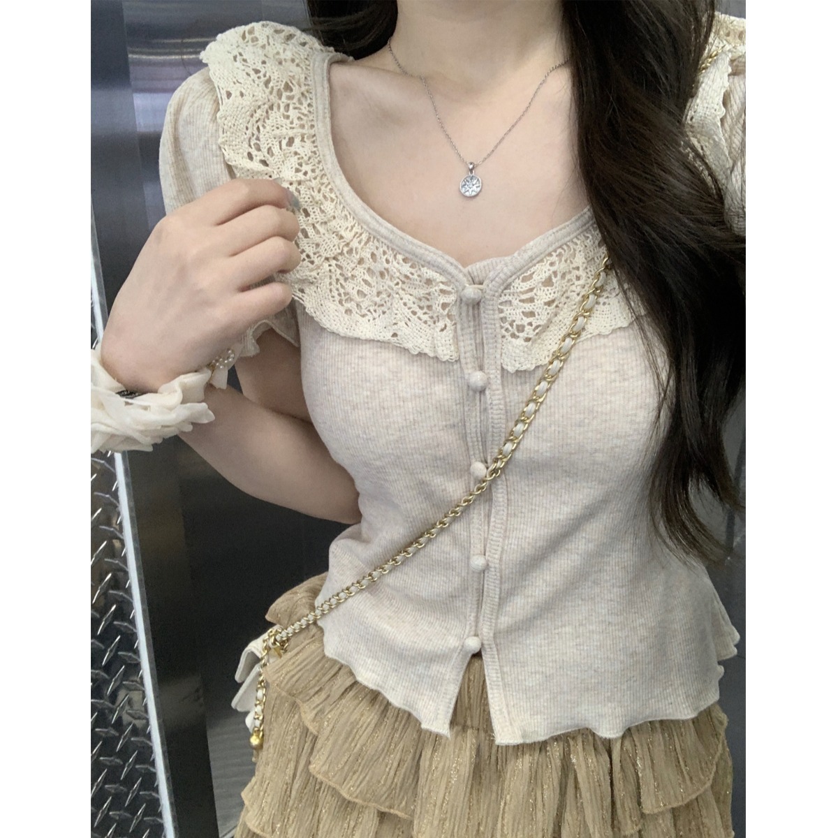 燕麦色纯欲甜美修身显瘦蕾丝花边开衫女夏小众针织短袖上衣设计感