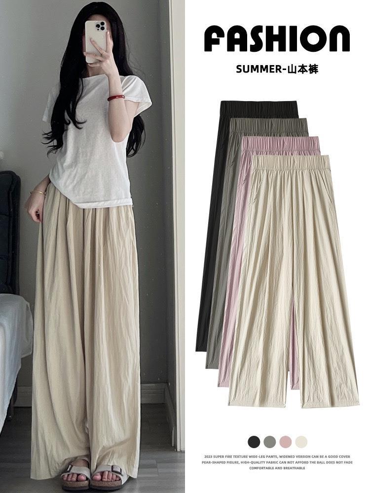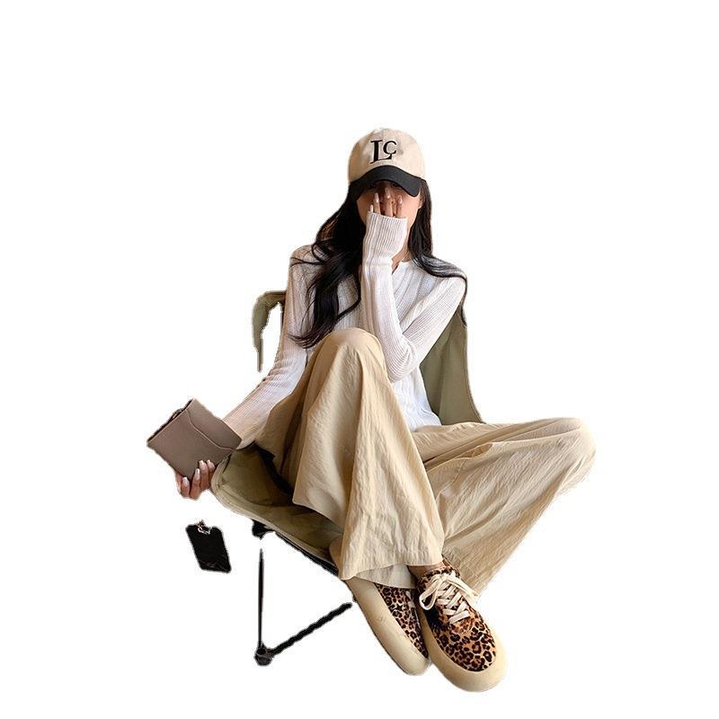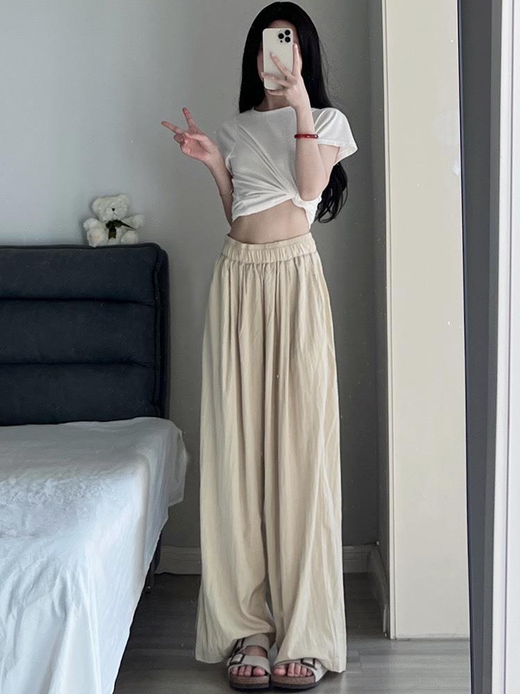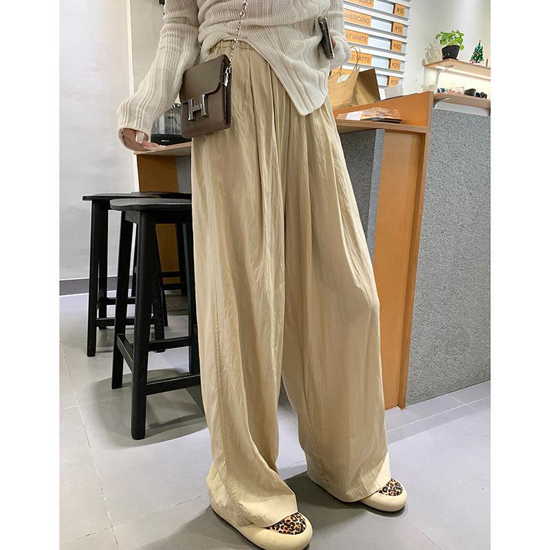 夏季新款卡其色阔腿裤女高腰垂感直筒宽松休闲褶皱休闲裤子潮