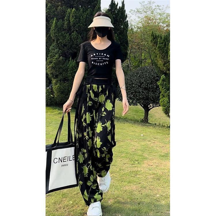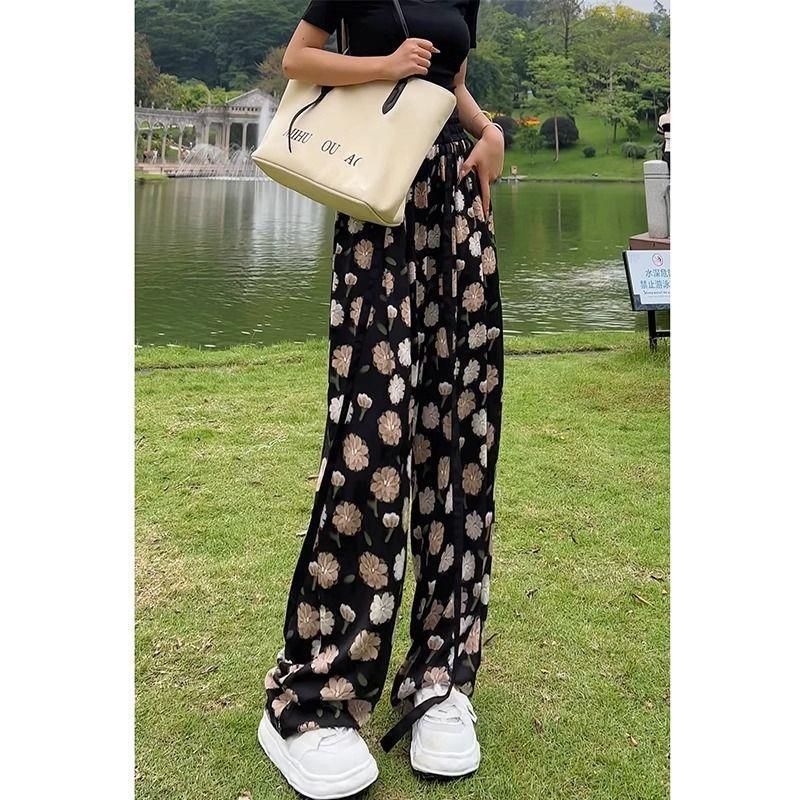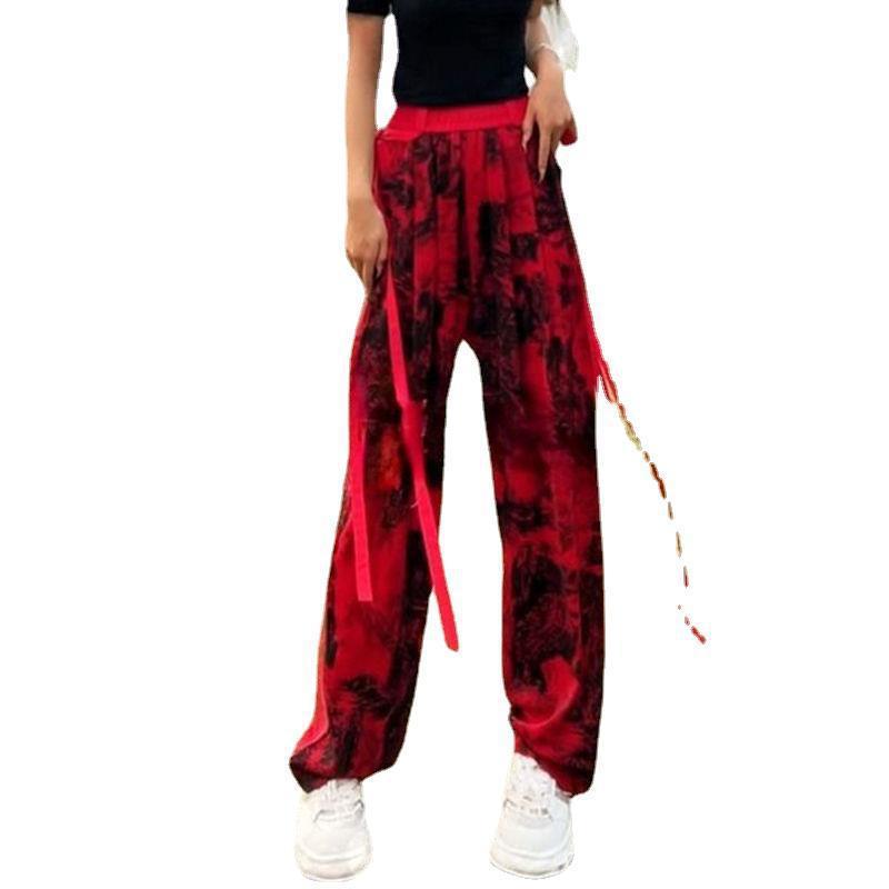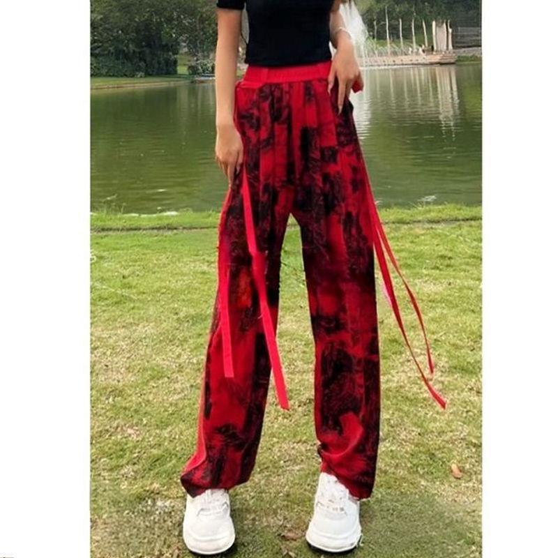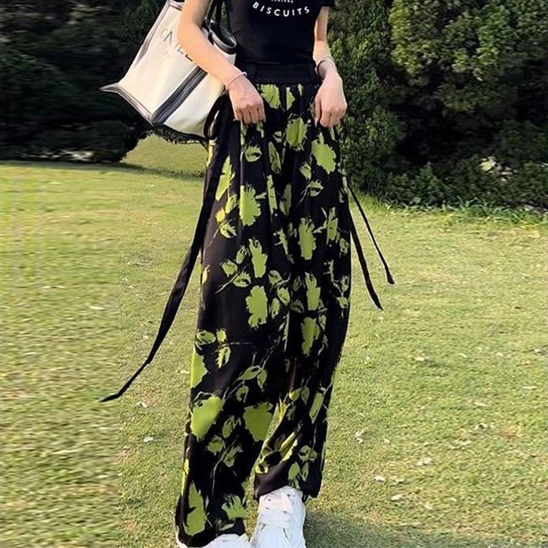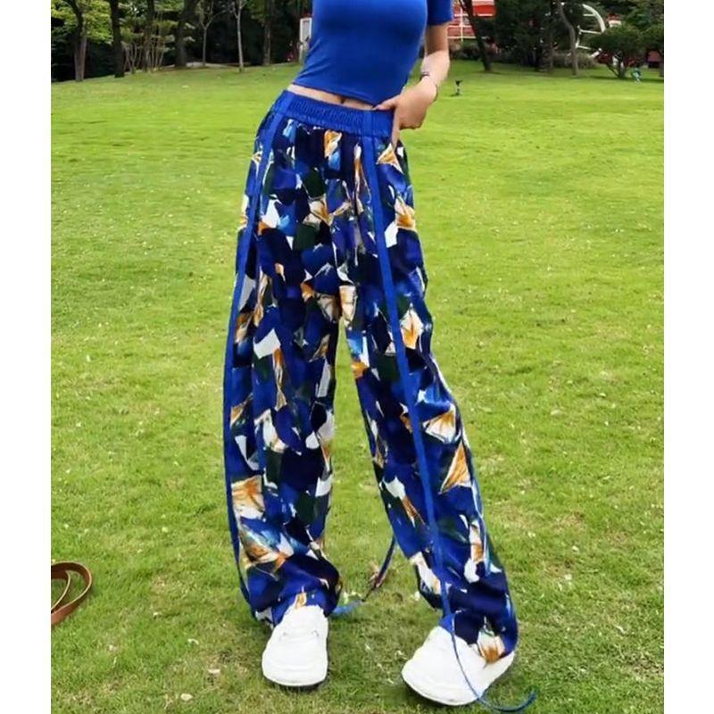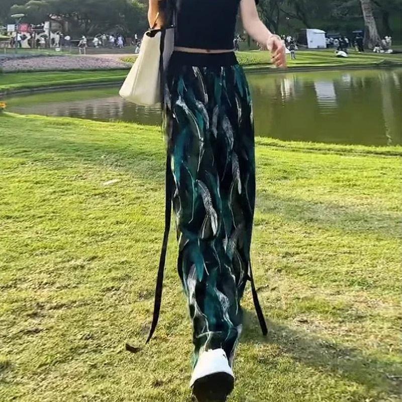 阔腿裤女新款夏季高腰印花设计垂坠感宽松百搭飘带扎染拖地裤