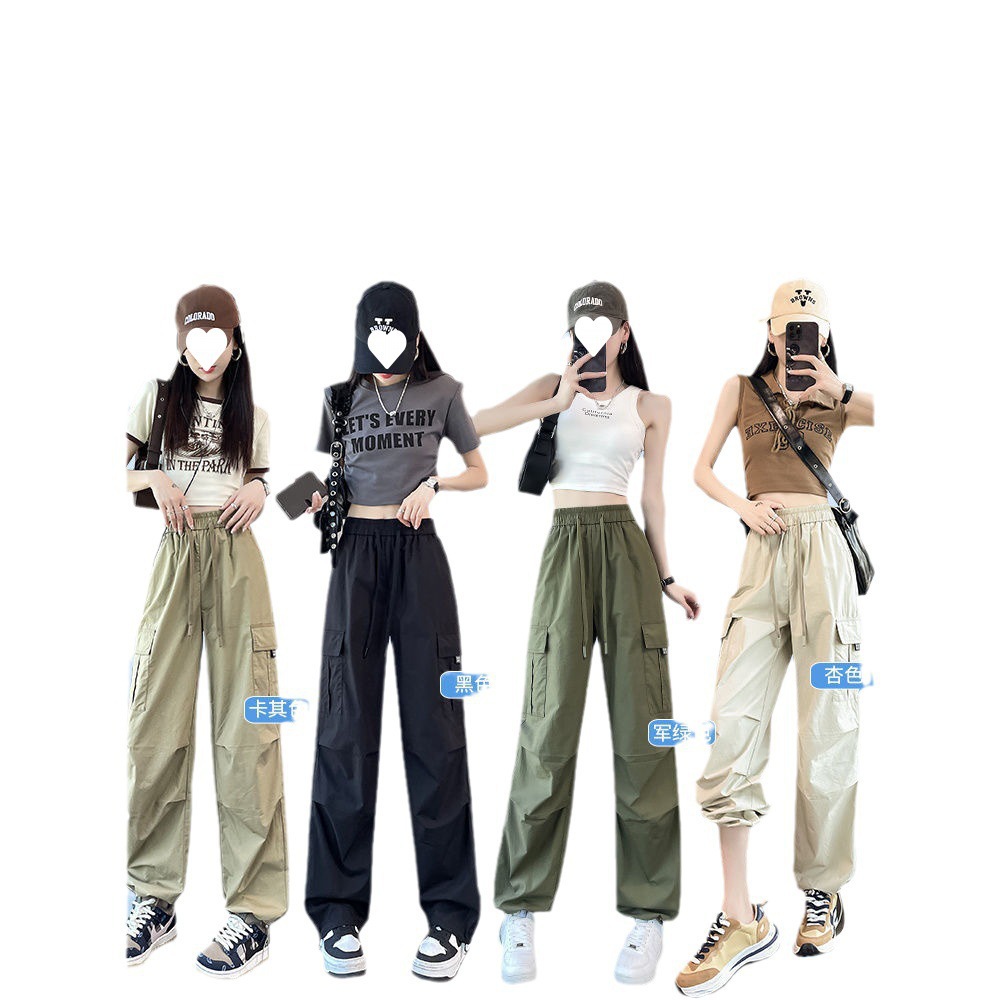 美式多口袋速干工装裤束脚裤休闲夏季薄款松紧腰窄版阔腿直筒裤