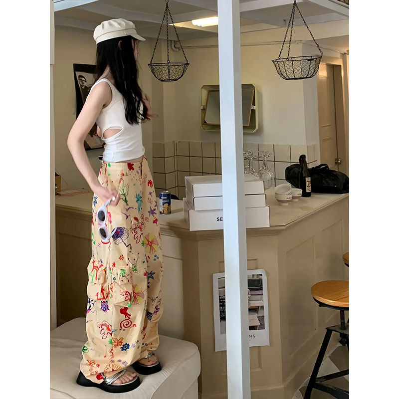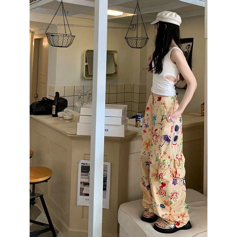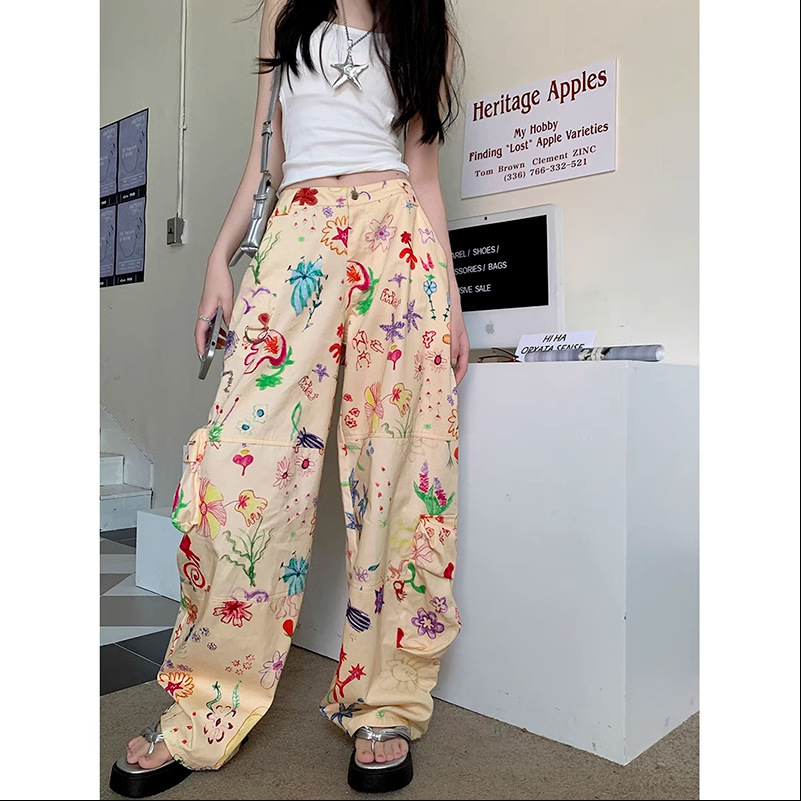 美式涂鸦花卉印花休闲工装裤夏季新款高级设计感高腰宽松拖地长裤