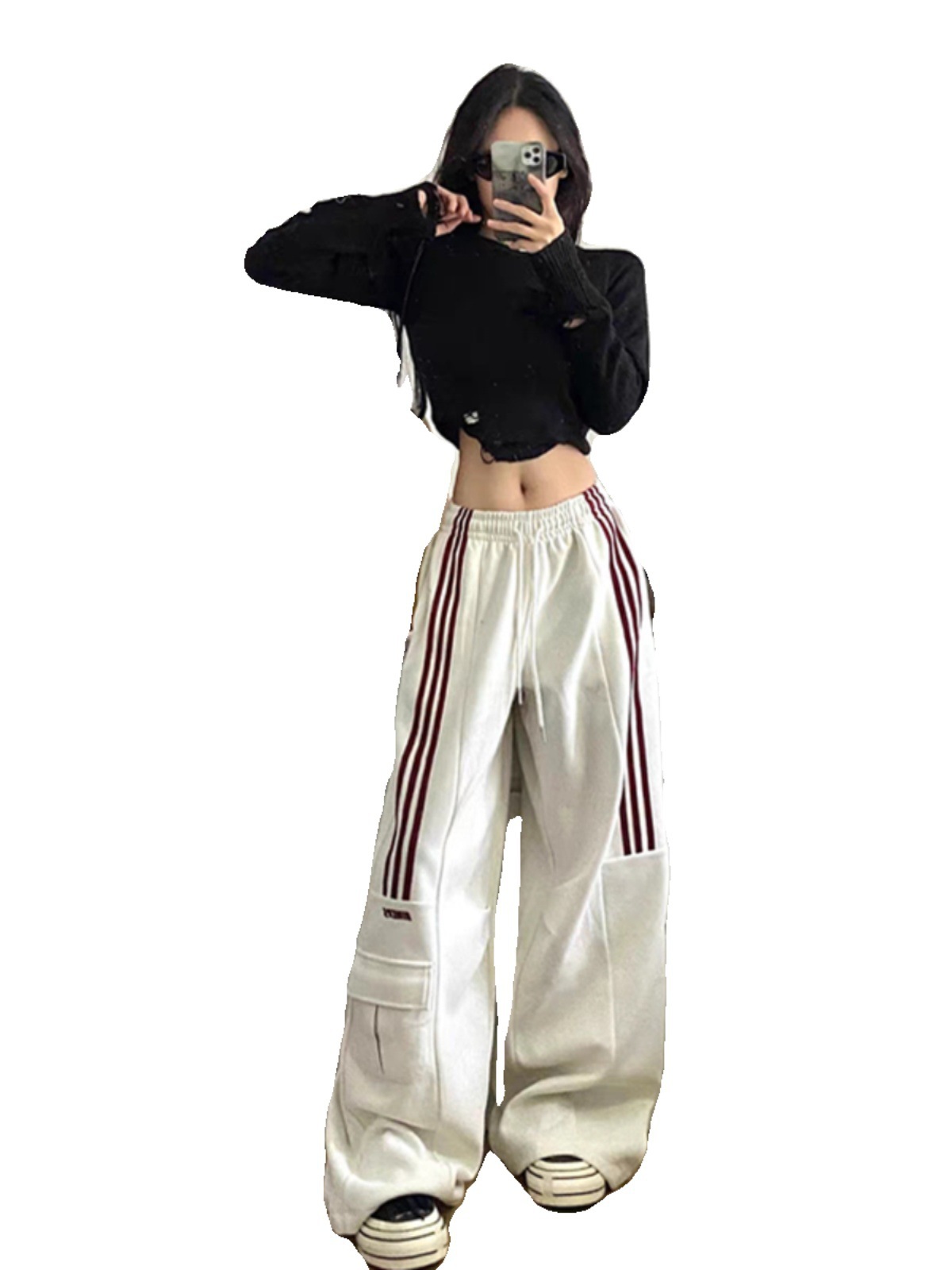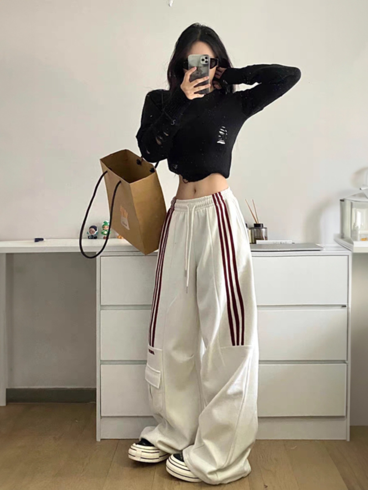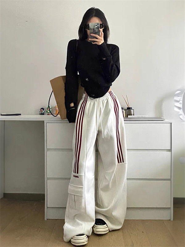 美式复古拼接三条杠高腰运动休闲裤女秋冬宽松阔腿百搭直筒工装裤