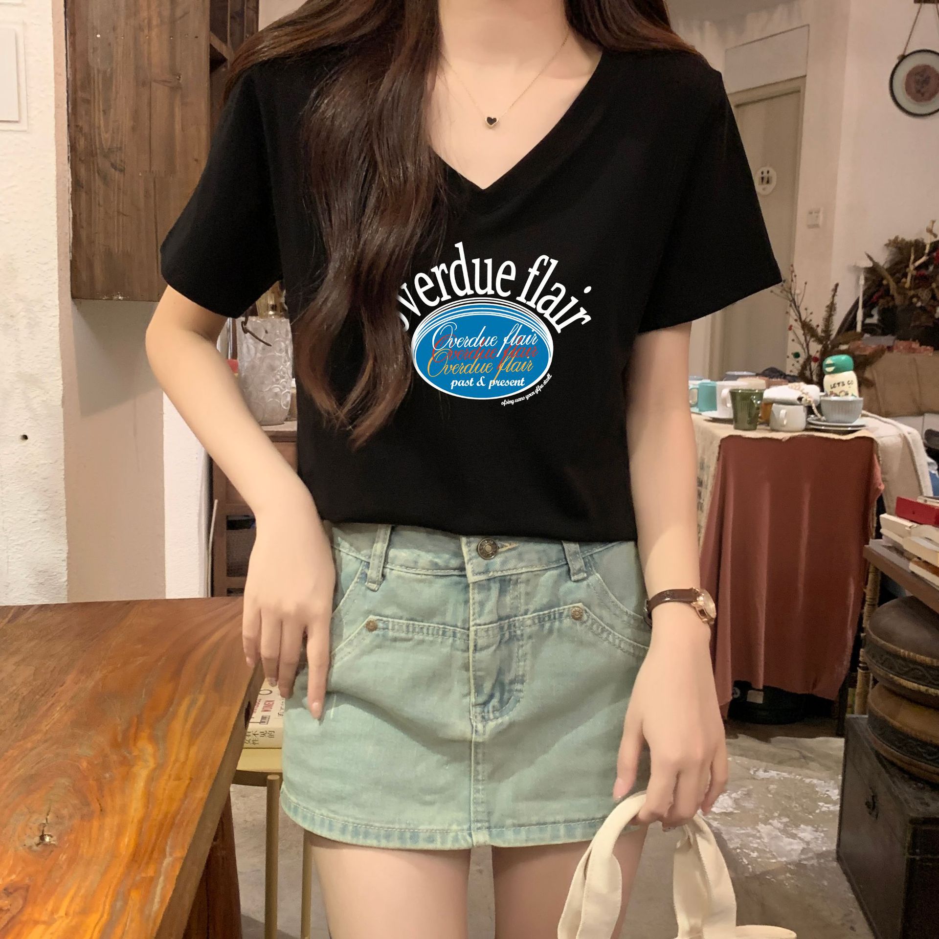 百搭V领宽松t恤女短袖新款夏季小众洋气减龄上衣女