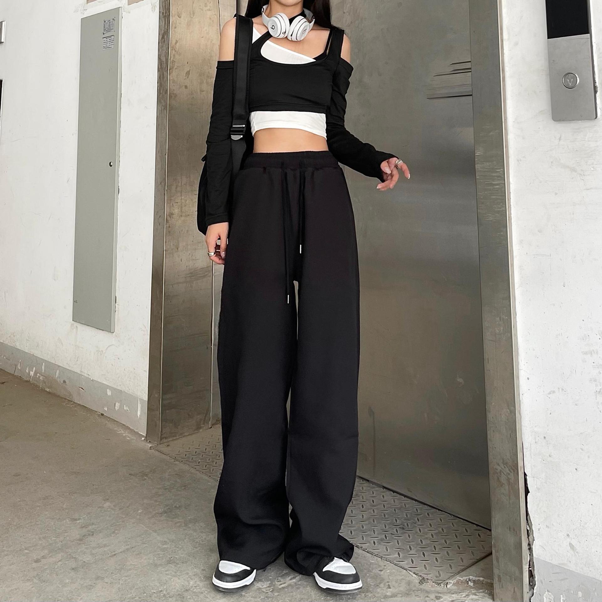 实拍大码休闲拖地运动裤子女秋装新款直筒高腰显瘦宽松阔腿裤