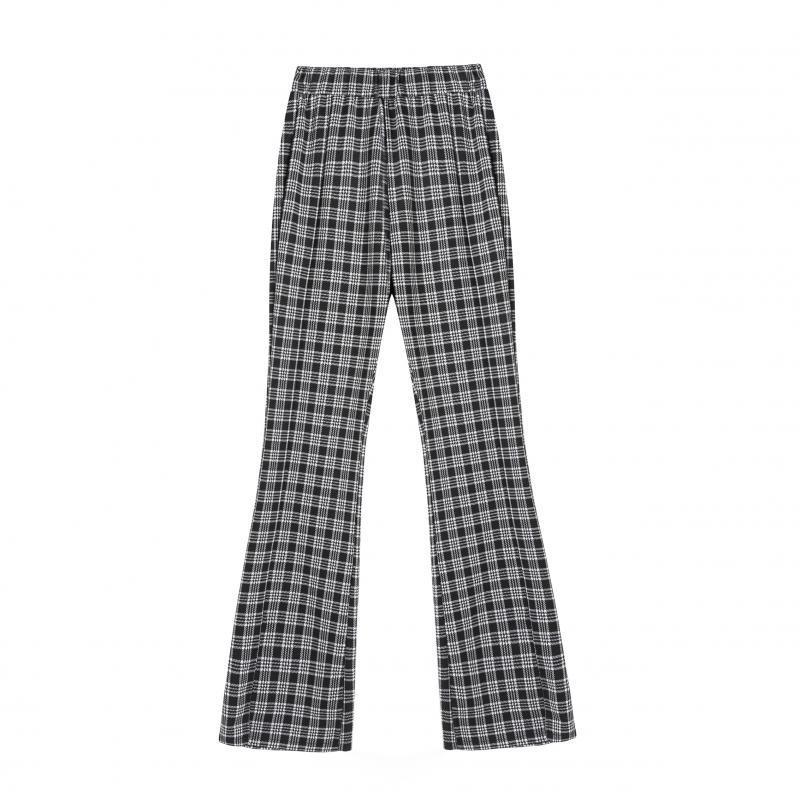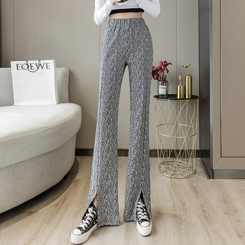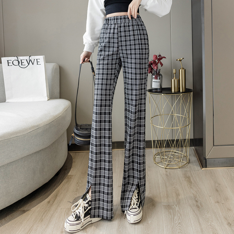 女装新款潮高腰开叉喇叭裤子显瘦格子休闲阔腿裤直筒拖地长裤