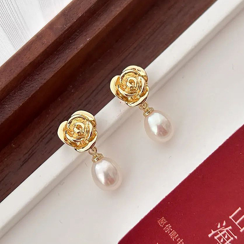 新款立体玫瑰花高级感耳饰珍珠耳钉女精致小花耳饰一件代发