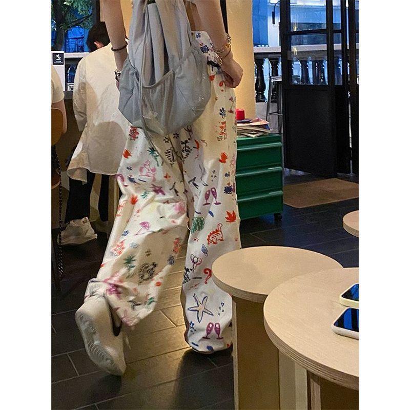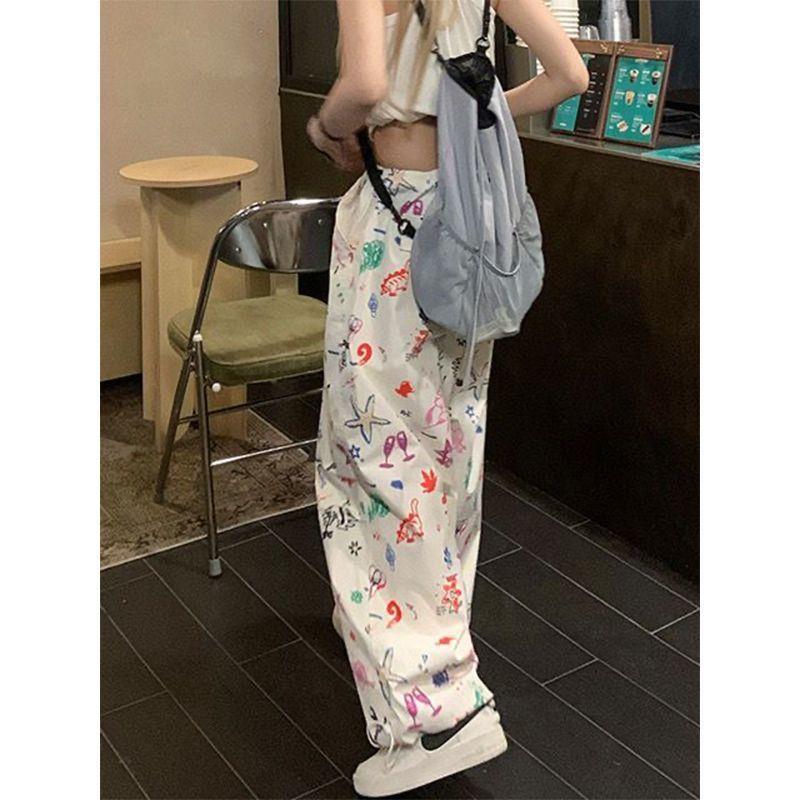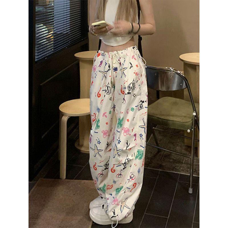 夏季高腰显瘦美式复古hiphop趣味涂鸦满印工装裤子女宽松束脚长裤