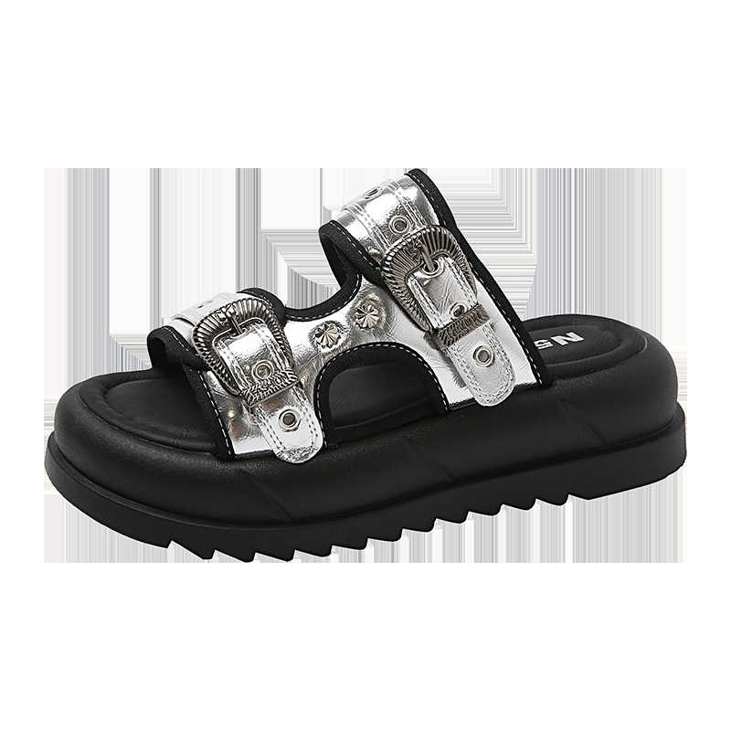 厚底松糕拖鞋女外穿夏季新款百搭金属扣一字沙滩配裙子凉拖鞋