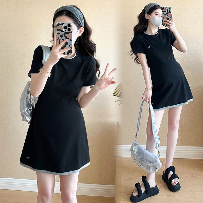 孕妇夏季连衣裙女2025新款小个子穿搭辣妈韩式假两件A字短裙夏天