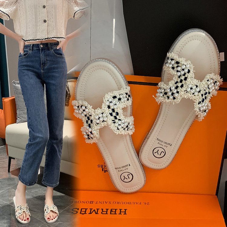 网红小香风珍珠拖鞋女夏外穿薄底一字拖软底舒适沙滩懒人凉拖