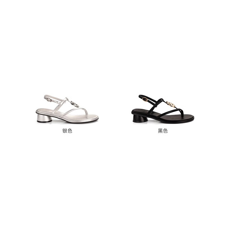 夏季新款度假风细带夹趾金属扣粗跟凉鞋女一字带高跟凉鞋