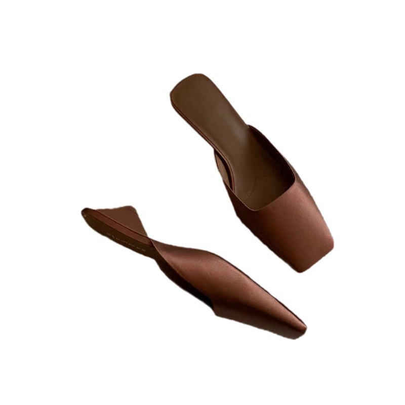 法式方头浅口缎面三角跟穆勒凉拖女夏季包头半拖