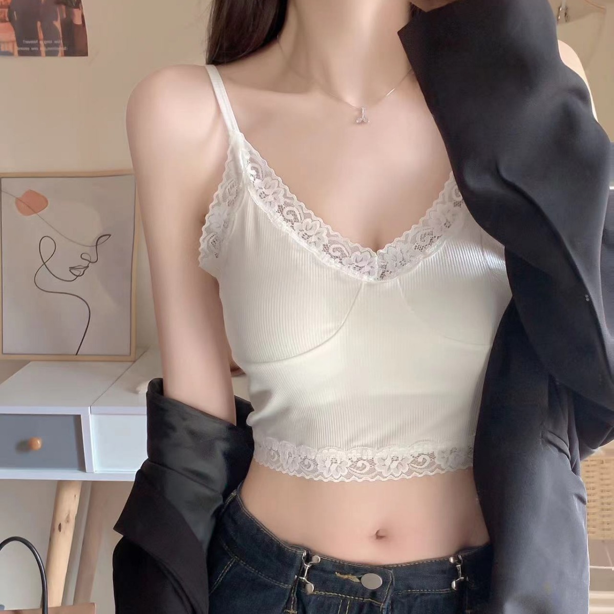 夏季新款蕾丝美背纯欲风带胸垫吊带背心女打底修身辣妹设计感上衣