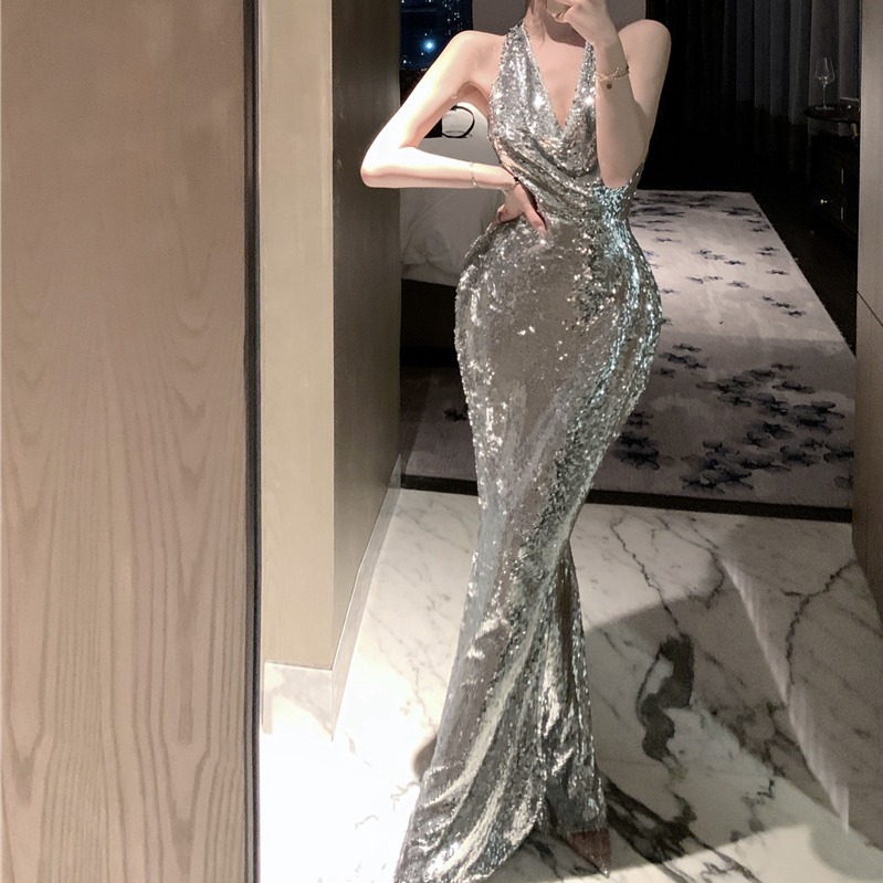 实拍夏季法式深V包臀亮片银色礼服高级感轻奢晚礼服挂脖连衣裙子