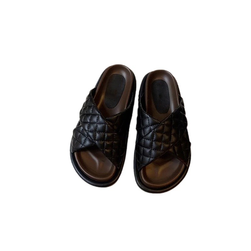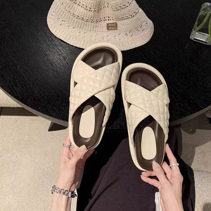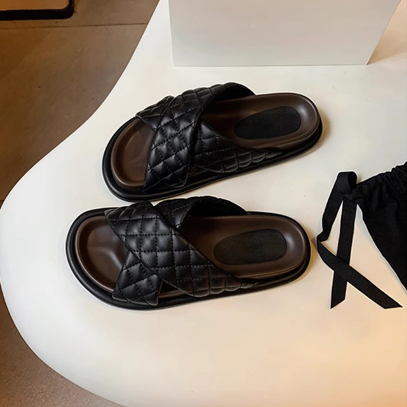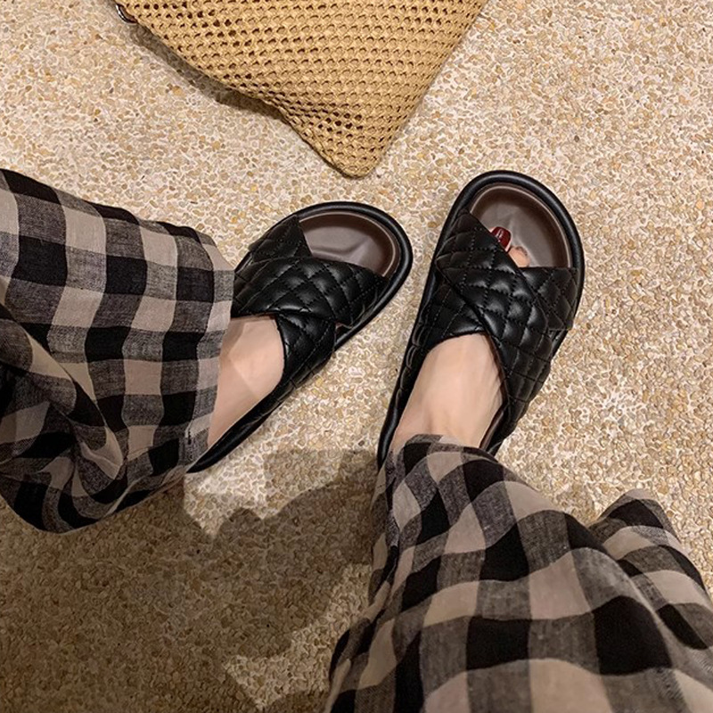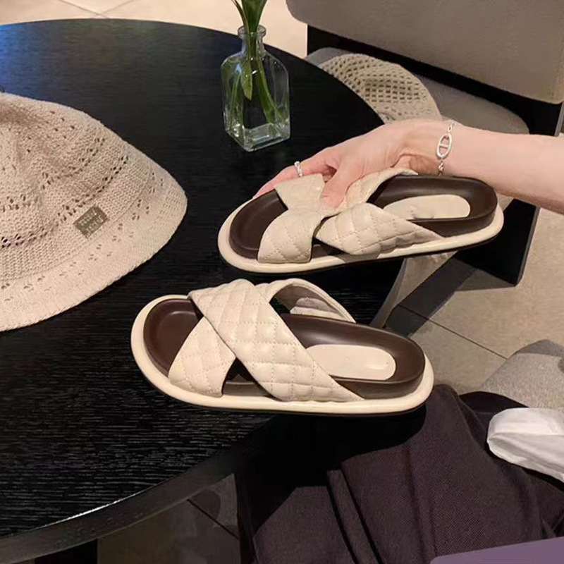 夏季新款软糯菱格交叉带平底拼色外穿拖鞋女