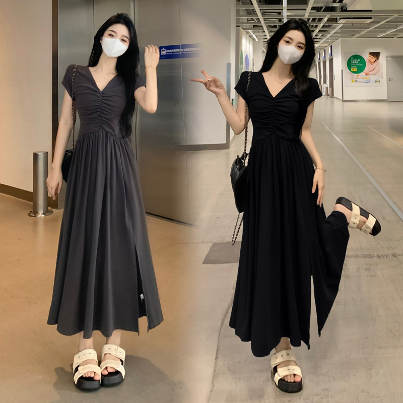 ~大码女装法式复古V领收腰连衣裙茶歇气质高级感度假开叉裙子