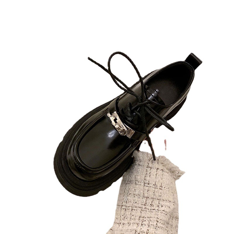 真皮乐福鞋女春秋新款系带厚底松糕跟单鞋英伦风黑色小皮鞋
