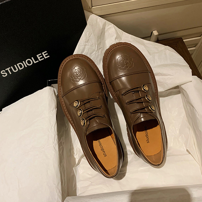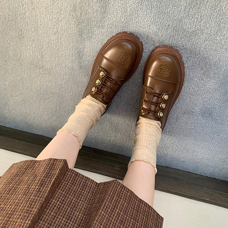 英伦金属扣复古刺绣乐福鞋春季圆头粗跟厚底小皮鞋单鞋女