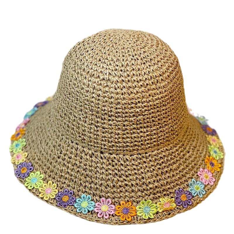 新款帽子女春夏彩色小花编织草帽可折叠防晒遮阳帽甜美可爱渔夫帽
