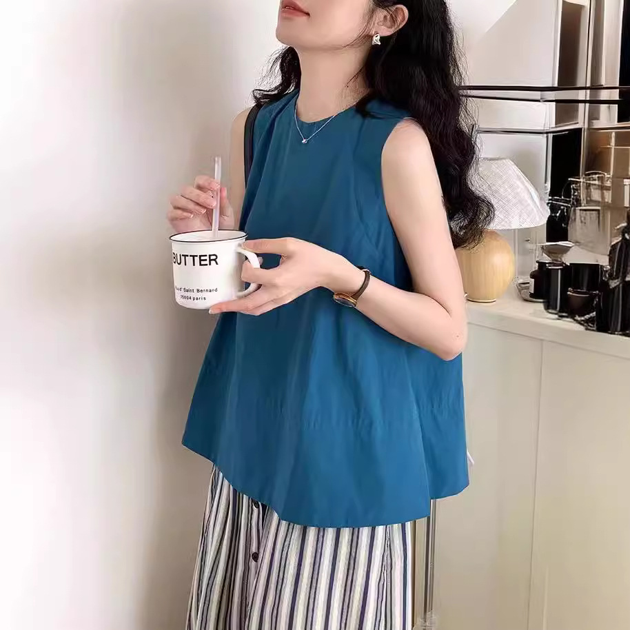 海岛小镇孔雀蓝简约圆领纯色背心娃娃衫夏季无袖上衣