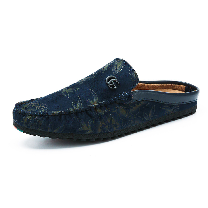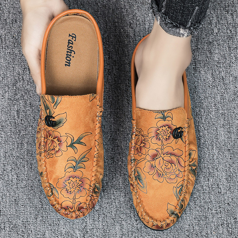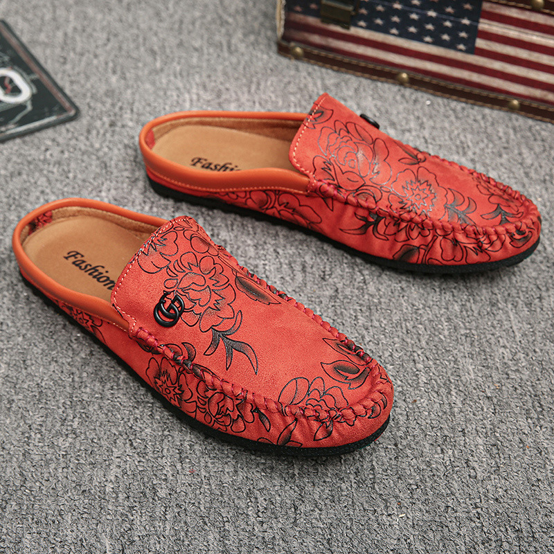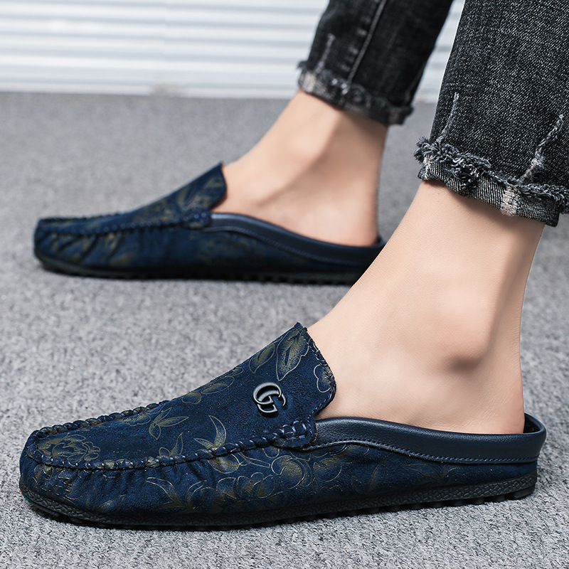 夏季休闲半拖豆豆鞋男没有后跟网红玫瑰绣花一脚蹬凉拖懒人驾车鞋