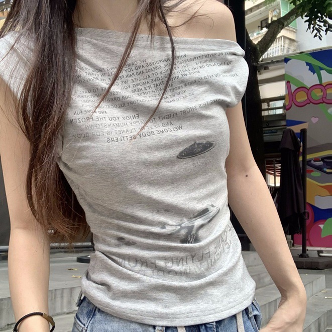 纯棉褶皱斜肩短袖t恤女夏季显瘦设计感名媛气质百搭上衣辣妹欧美