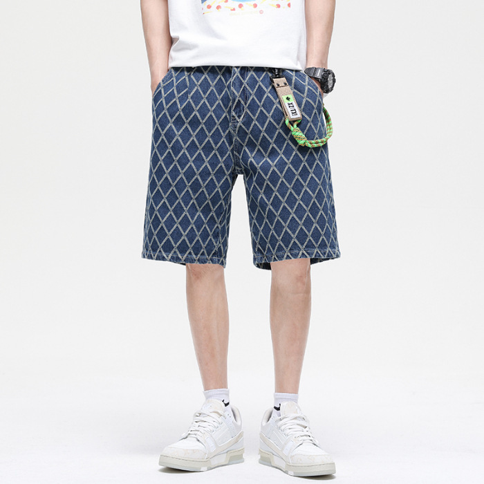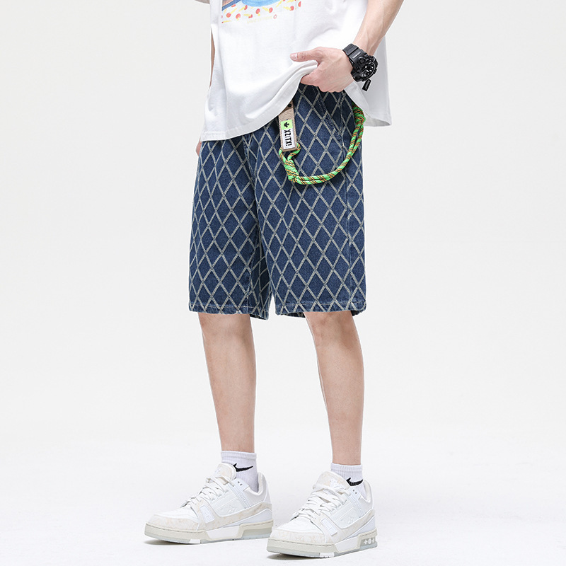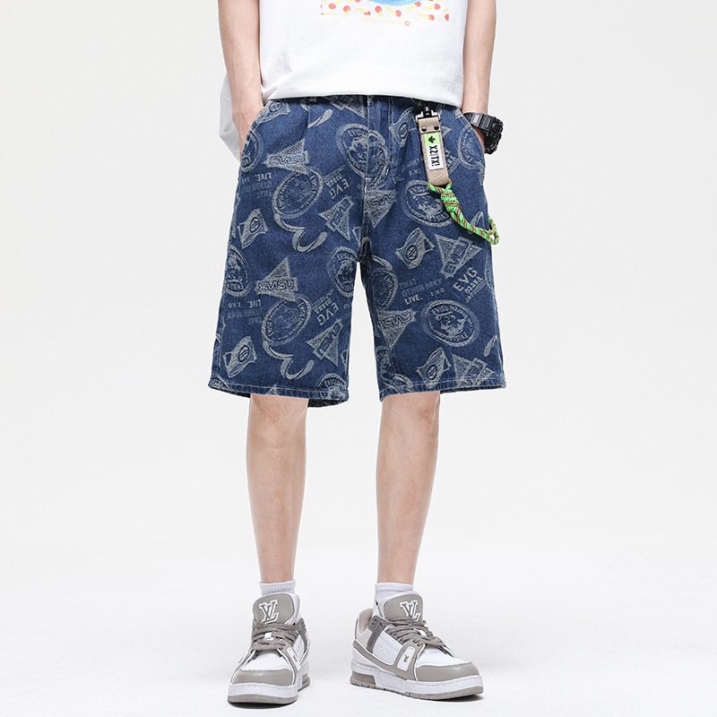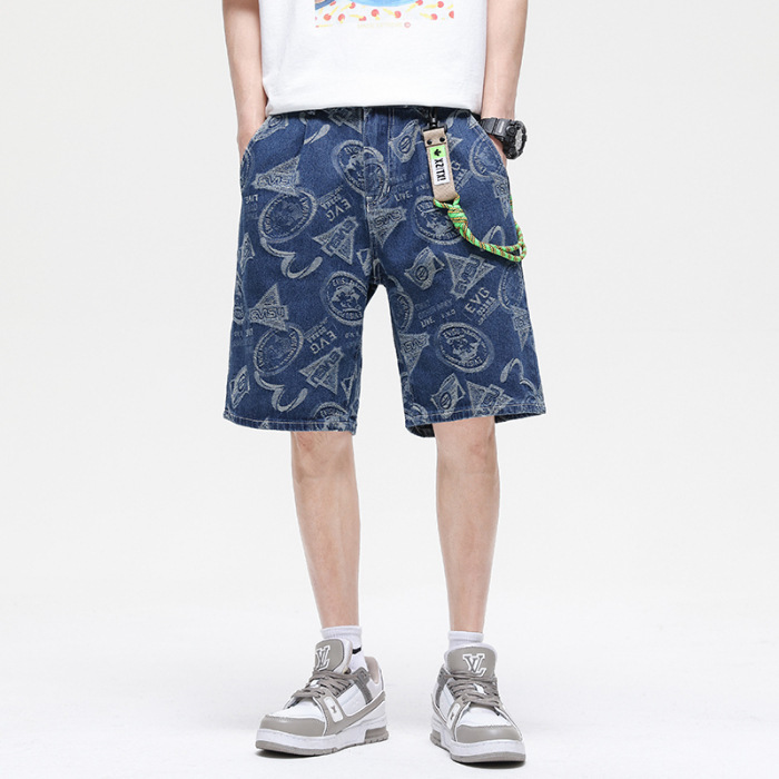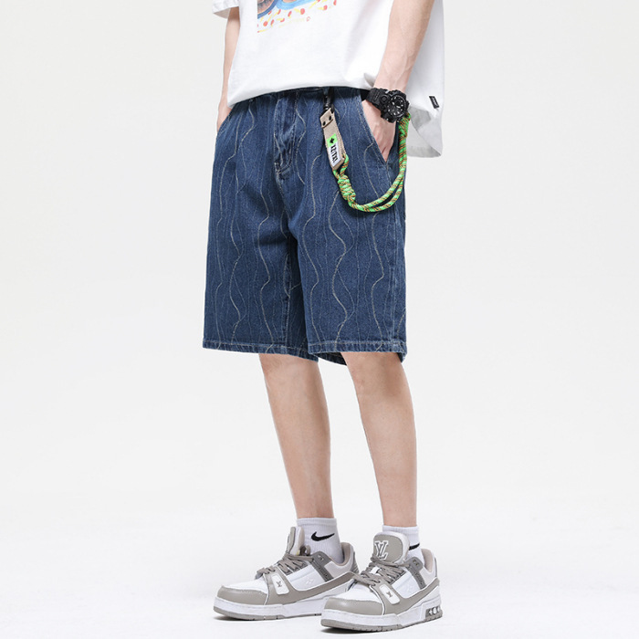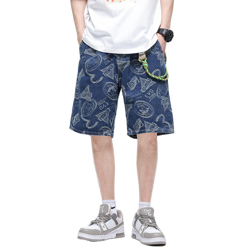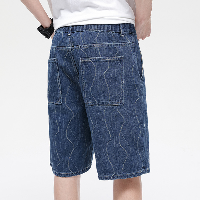 夏款 美式高街 休闲潮牌 提花牛仔短裤 男宽松大码五分裤蓝色