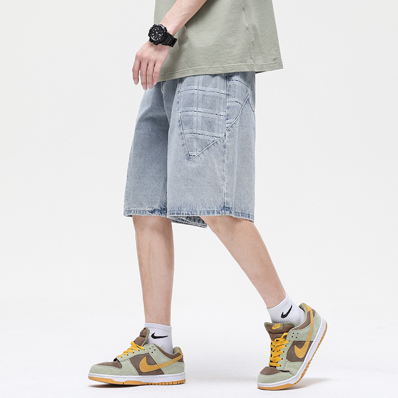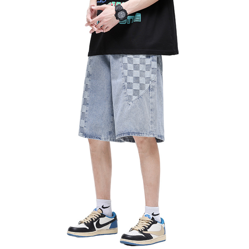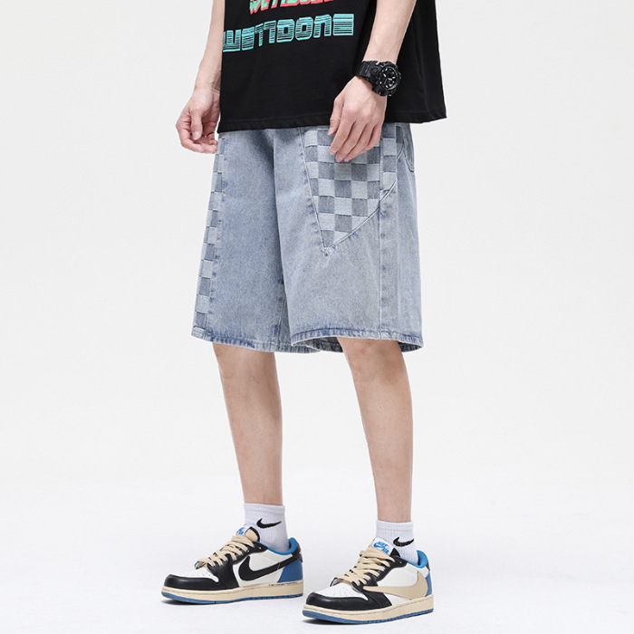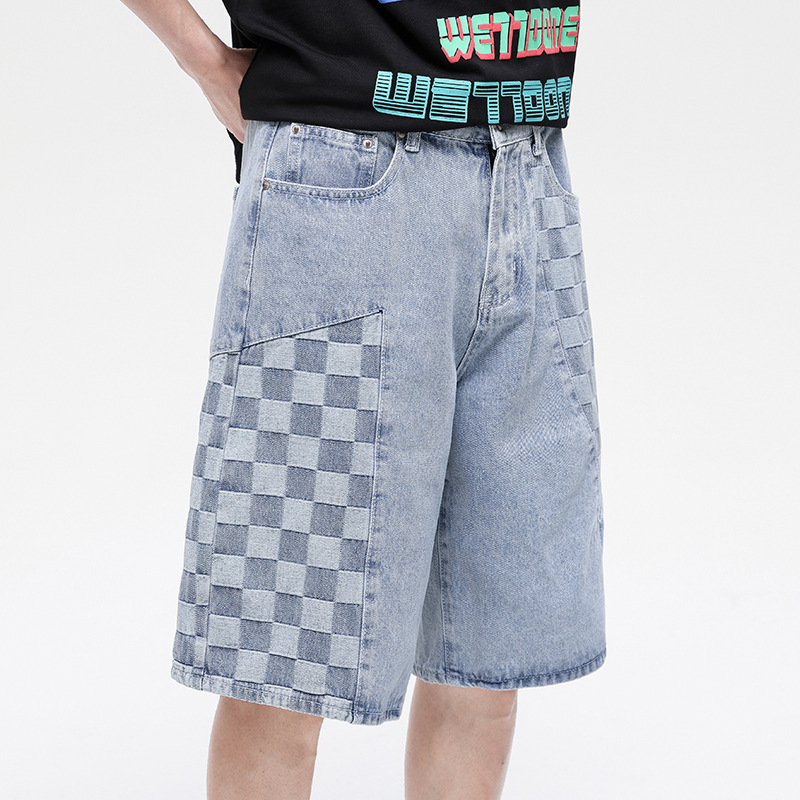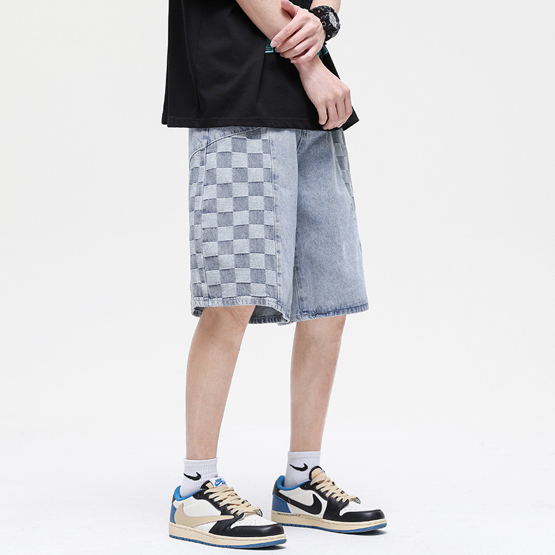 夏款潮牌美式高街休闲提花牛仔短裤男宽松大码五分裤大方格棉