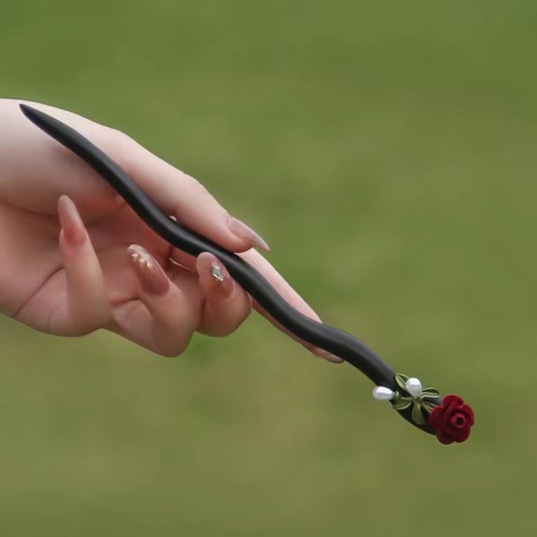 玫瑰发簪结婚古风女高级感新中式步摇钗子檀木盘发发张簪子