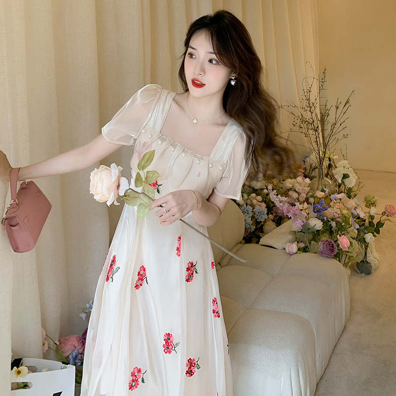 夏季新款法式复古方领重工绣花仙女裙子短袖雪纺中长款连衣裙