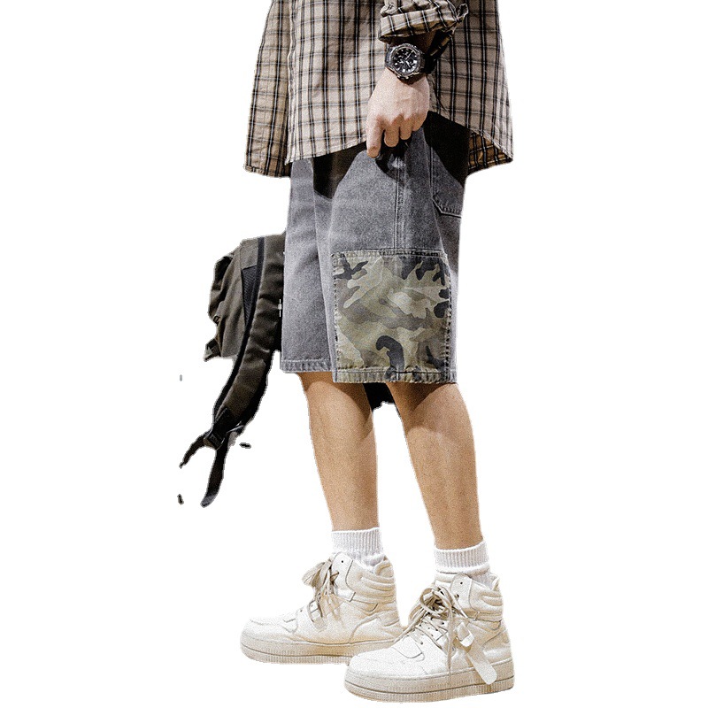 纯棉迷彩拼接牛仔短裤男夏季潮牌宽松大码ins男士五分裤百搭中裤