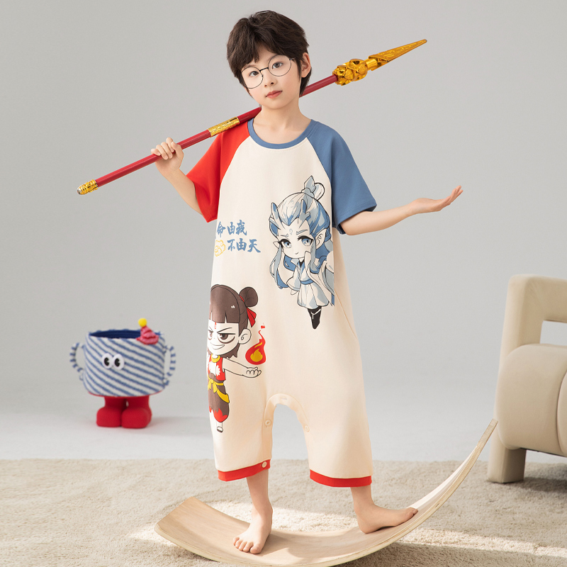 男童连体睡衣哪吒夏季纯棉短袖连身衣儿童空调家居服大童宝宝睡袋