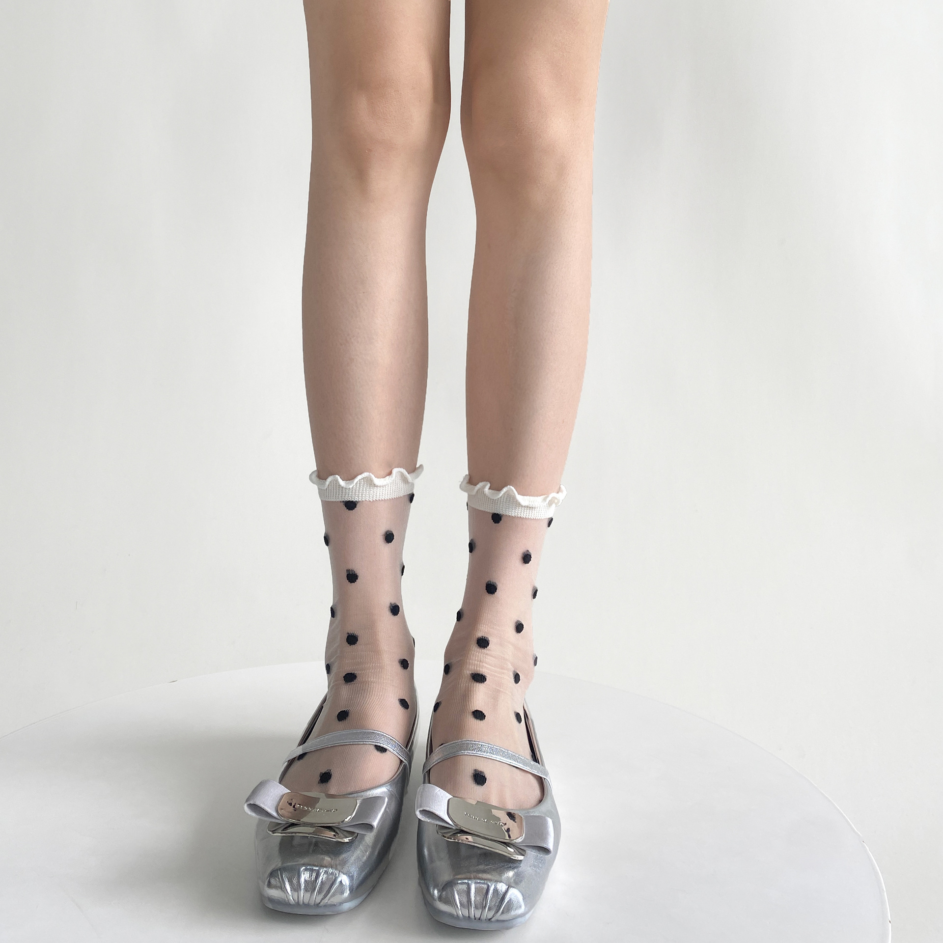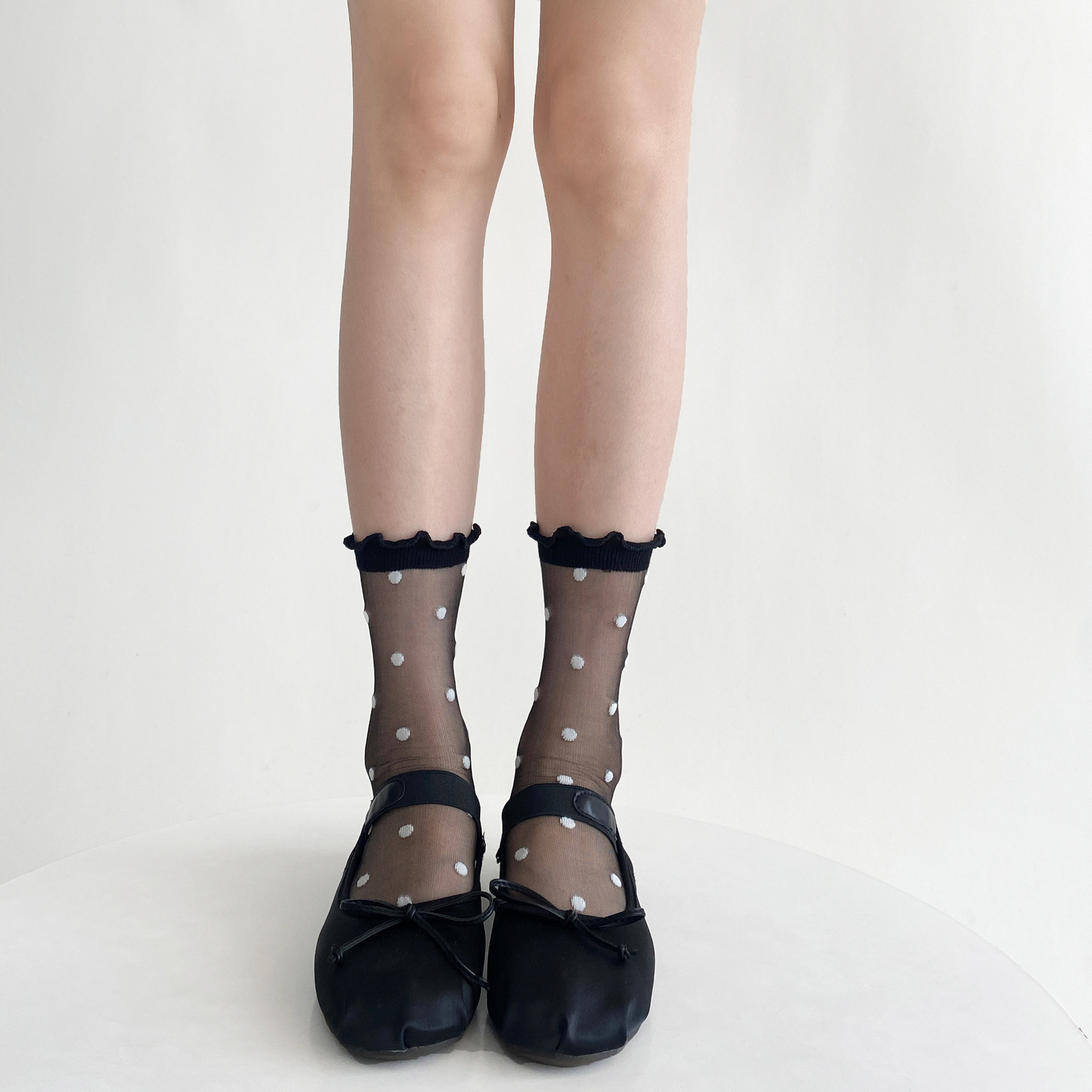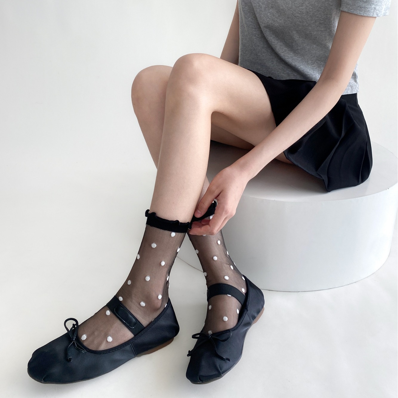 夏季清凉穿搭超薄玻璃丝波点中筒丝袜女黑白木耳边透肉甜美短袜