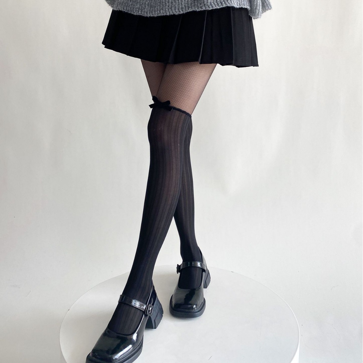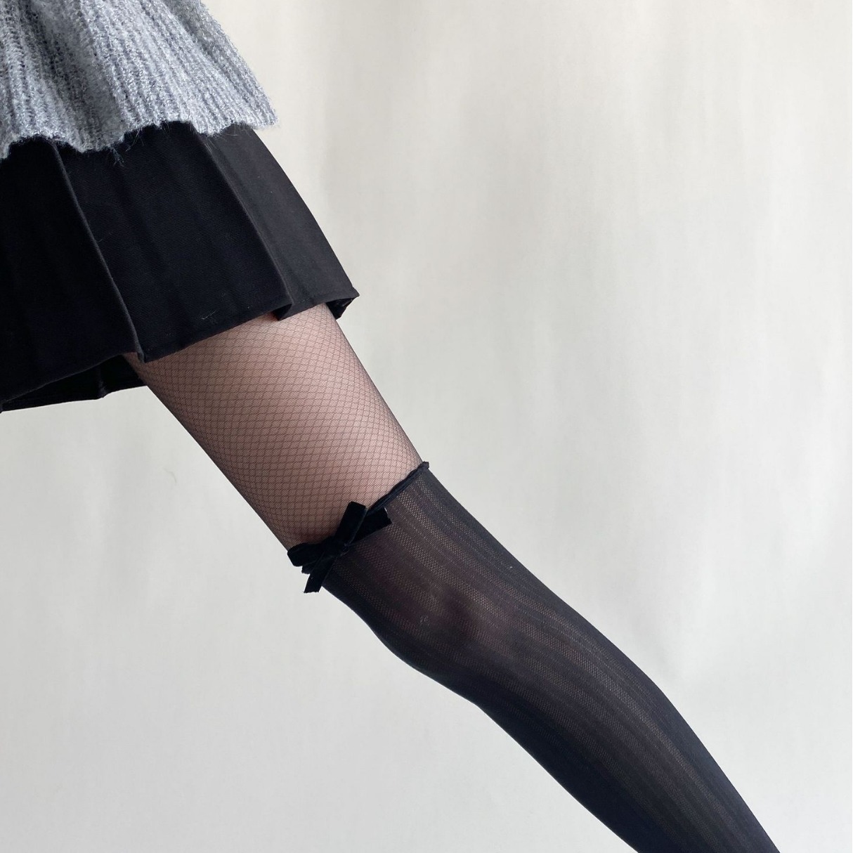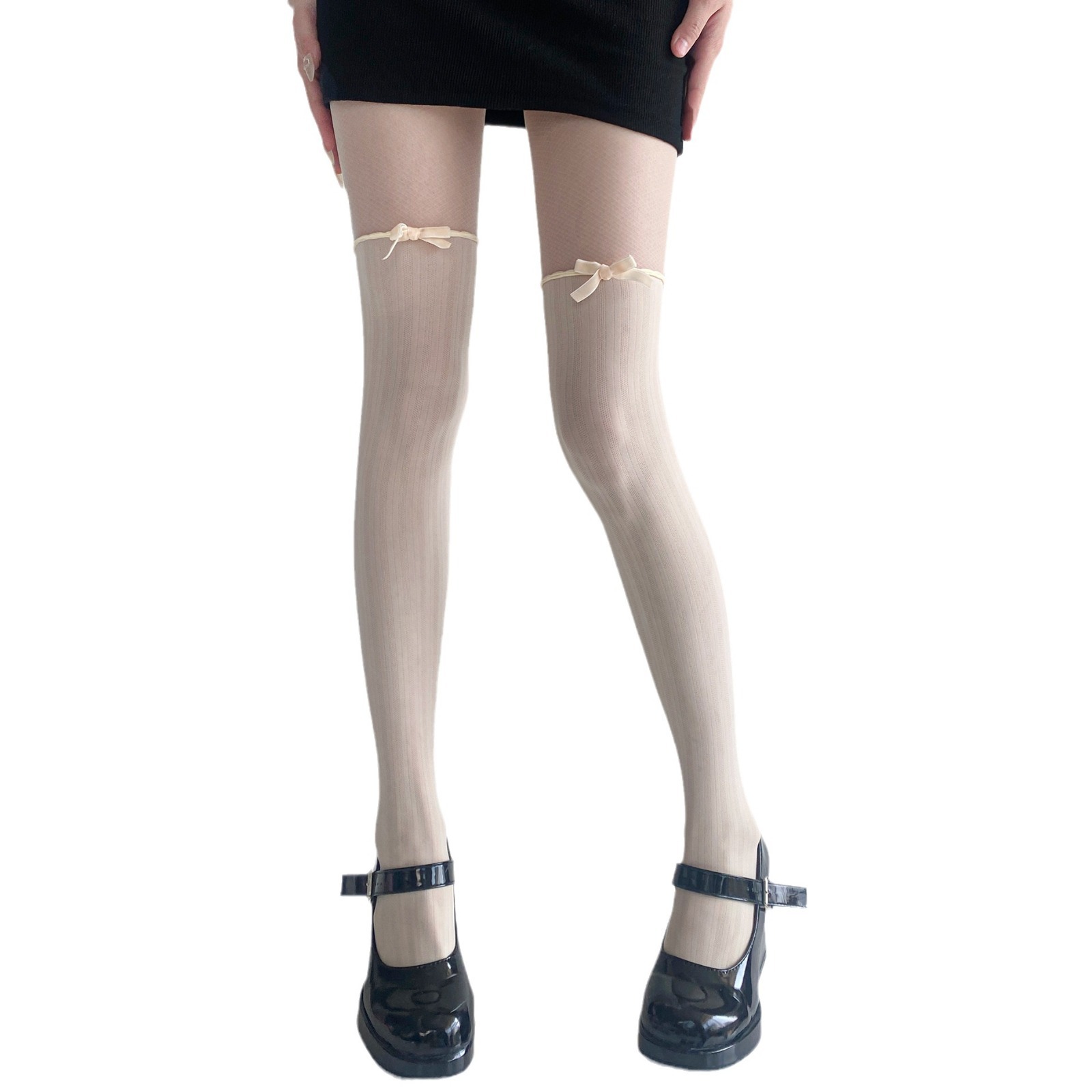 春夏季纯欲风暗纹木耳边丝绒蝴蝶结网格拼接奶白色丝袜黑丝连裤袜