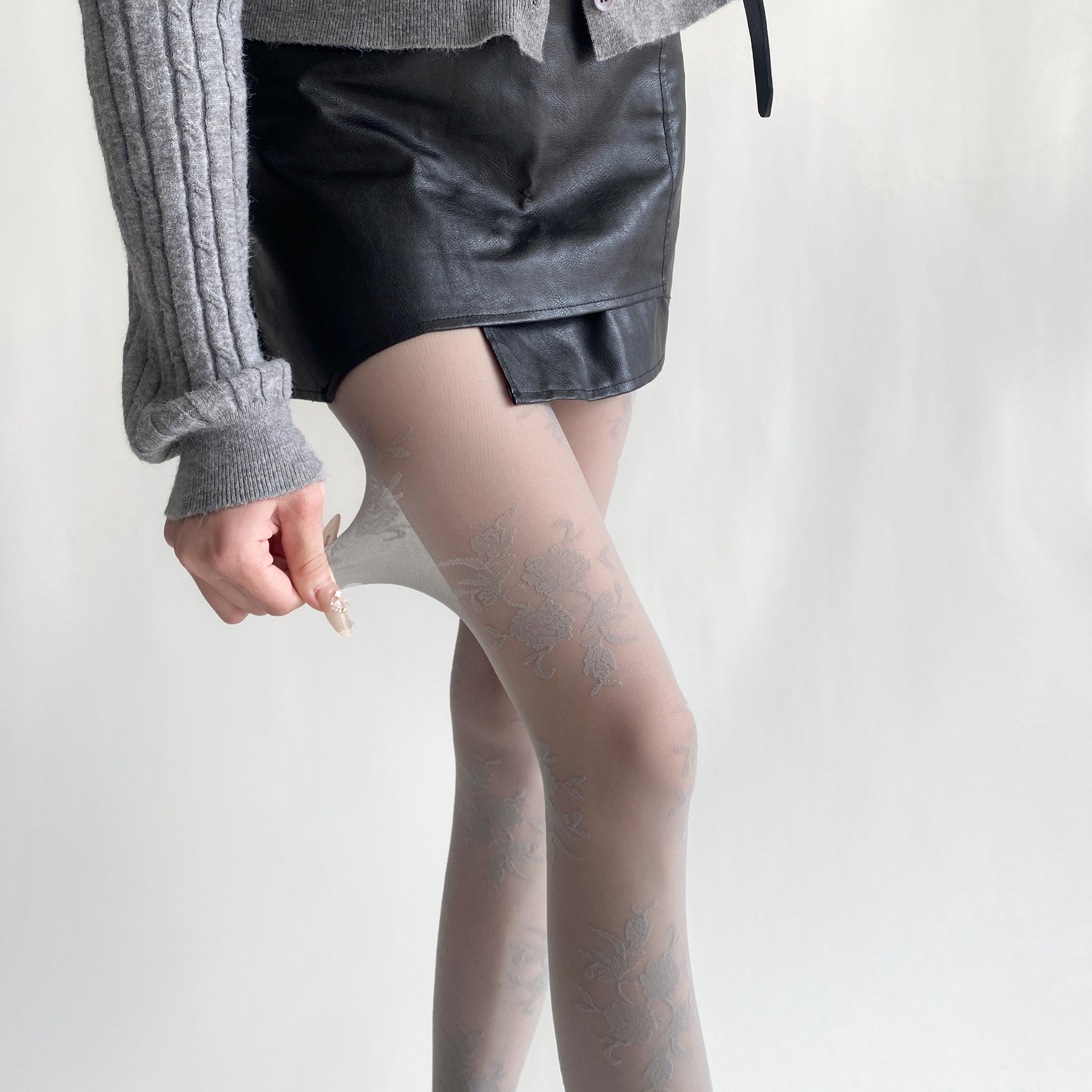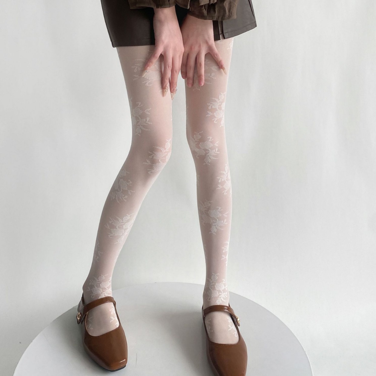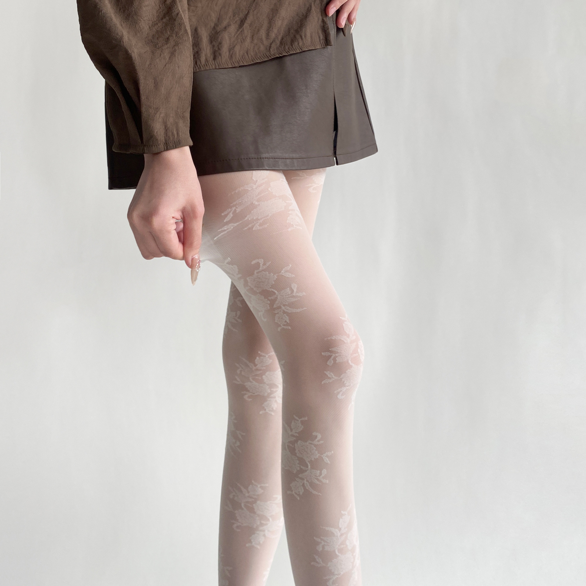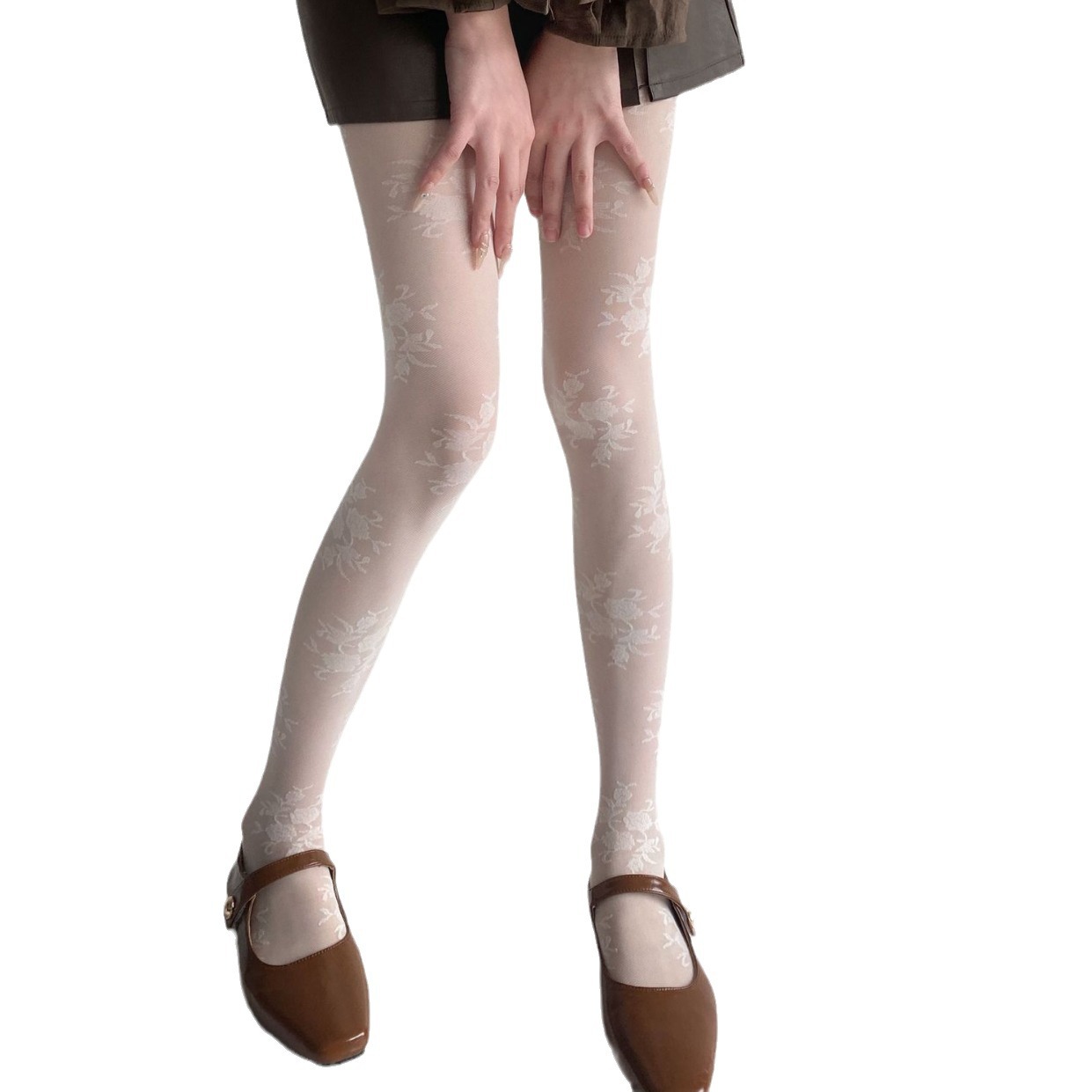春夏季ins复古奶白色蔷薇玫瑰提花丝袜蕾丝薄款黑丝防脱丝连裤袜
