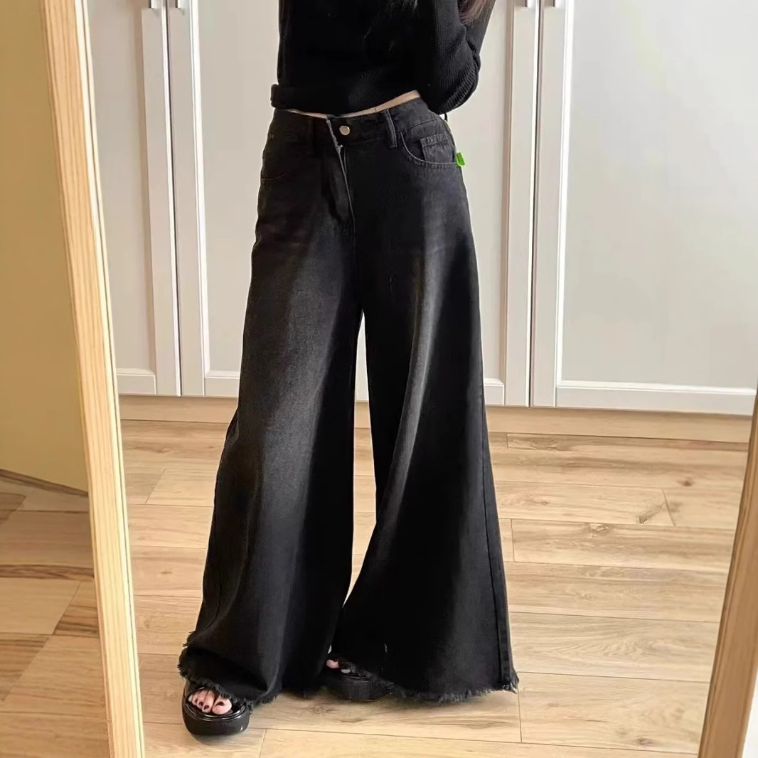 复古黑灰春夏阔腿毛边牛仔裤女美式显瘦新款小个子宽松高腰拖地裤