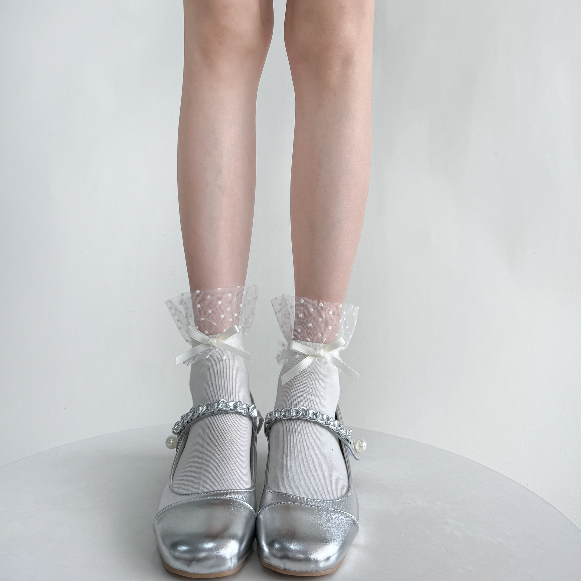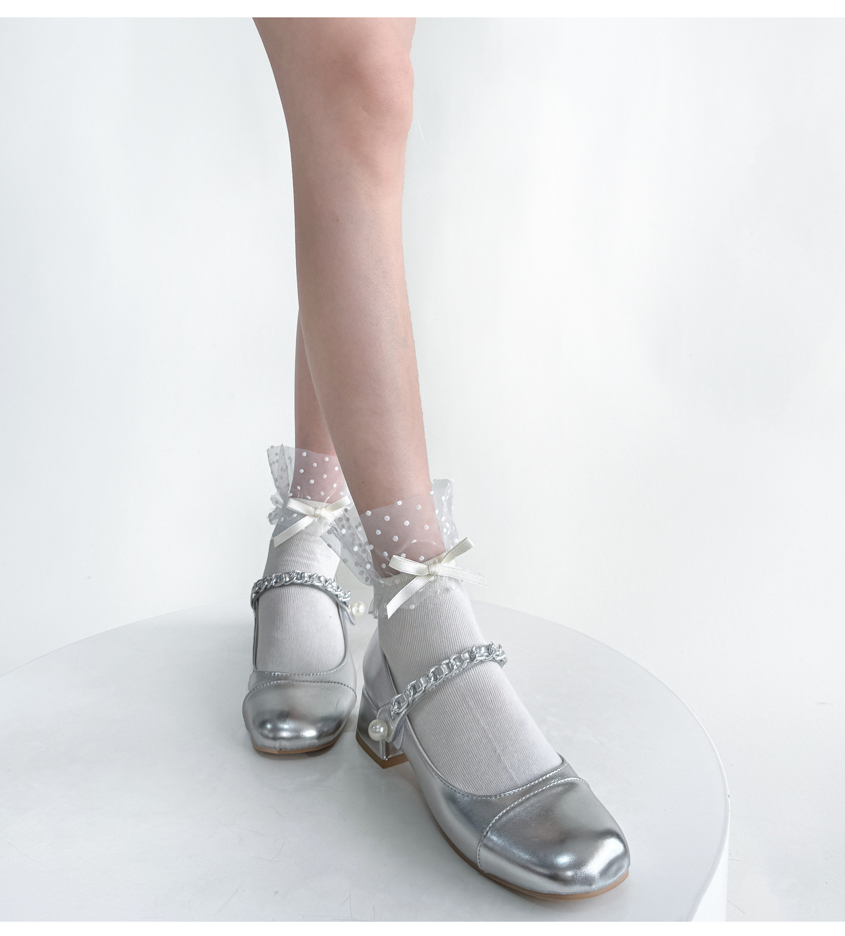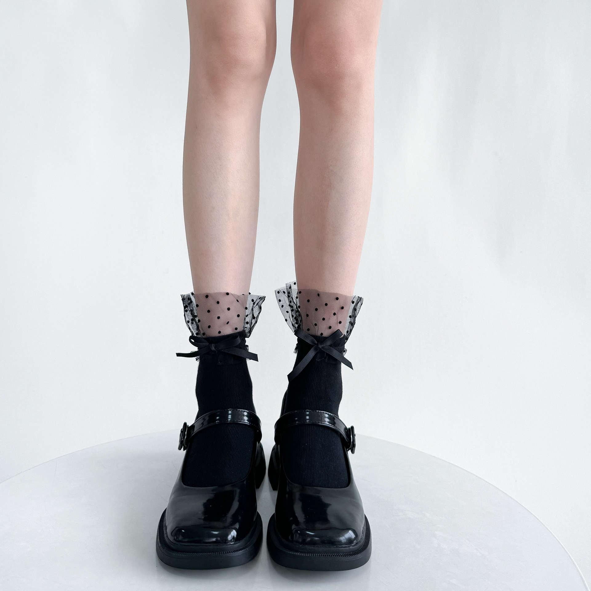 少女波点网纱花边中筒袜黑色洛丽塔棉袜蝴蝶结甜美短袜白色女夏季